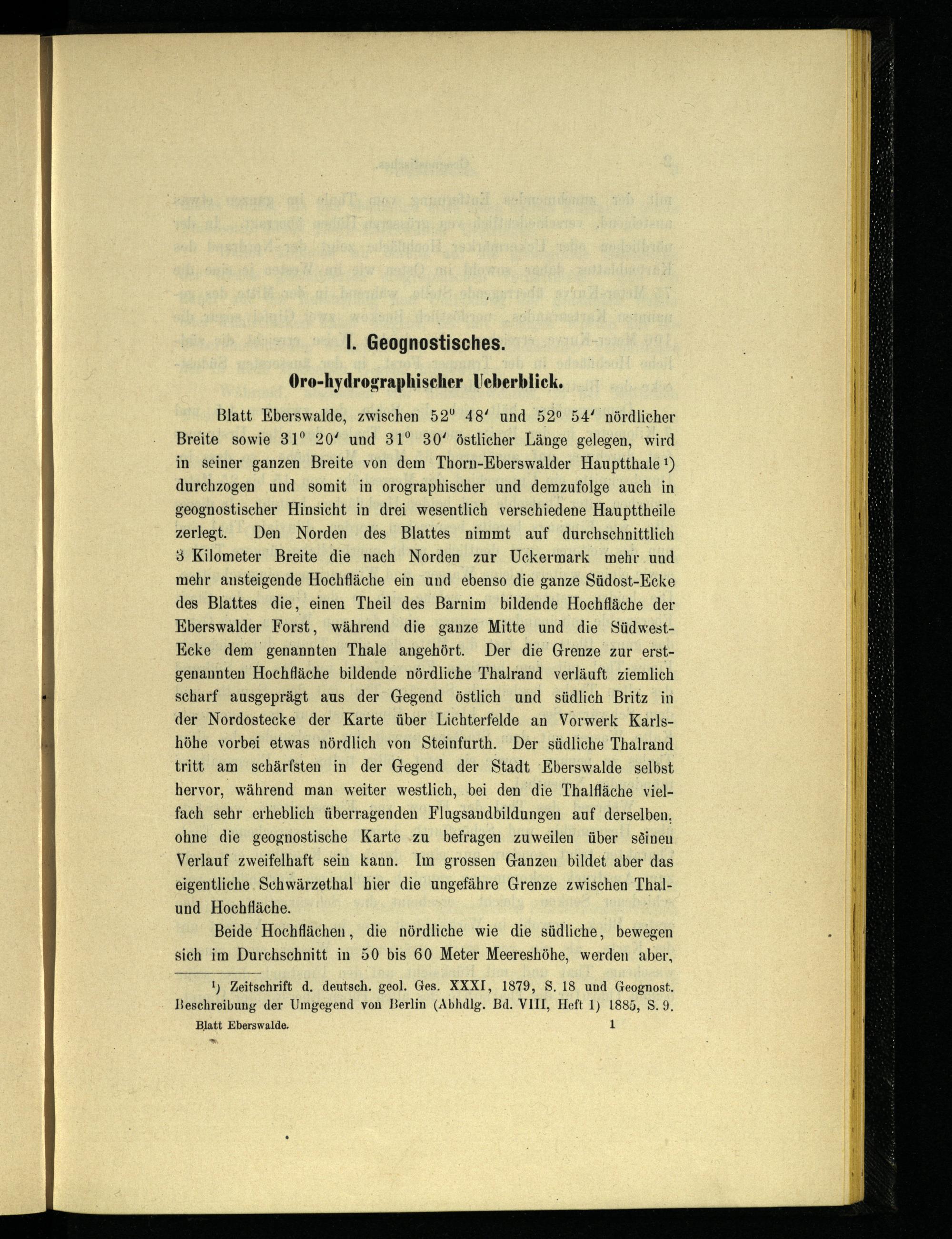 Blatt Eberswalde , zwischen 52° 48' und 52° 54' nördlicher Breite sowie 31° 20' und 31° 30' östlicher Länge gelegen, wird in seiner ganzen Breite von dem Thorn-Eberswalder Hauptthale *) durchzogen und somit in orographischer und demzufolge auch in geognostischer Hinsicht in drei wesentlich verschiedene Haupttheile zerlegt. Den Norden des Blattes nimmt auf durchschnittlich 3 Kilometer Breite die nach Norden zur Uckermark mehr und mehr ansteigende Hochfläche ein und ebenso die ganze Südost-Ecke des Blattes die, einen Theil des Barnim bildende Hochfläche der Eberswalder Forst, während die ganze Mitte und die Südwest- Ecke dem genannten Thale angehört. Der die Grenze zur erstgenannten Hochfläche bildende nördliche Thalrand verläuft ziemlich scharf ausgeprägt aus der Gegend östlich und südlich Britz in der Nordostecke der Karte über Lichterfelde an Vorwerk Karlshöhe vorbei etwas nördlich von Steinfurth . Der südliche Thalrand tritt am schärfsten in der Gegend der Stadt Eberswalde selbst hervor, während man weiter westlich, bei den die Thalfläche vielfach sehr erheblich überragenden Flugsandbildungen auf derselben, ohne die geognostische Karte zu befragen zuweilen über seinen Verlauf zweifelhaft sein kann. Im grossen Ganzen bildet aber das eigentliche Schwärzethal hier die ungefähre Grenze zwischen Thal- und Hochfläche.
