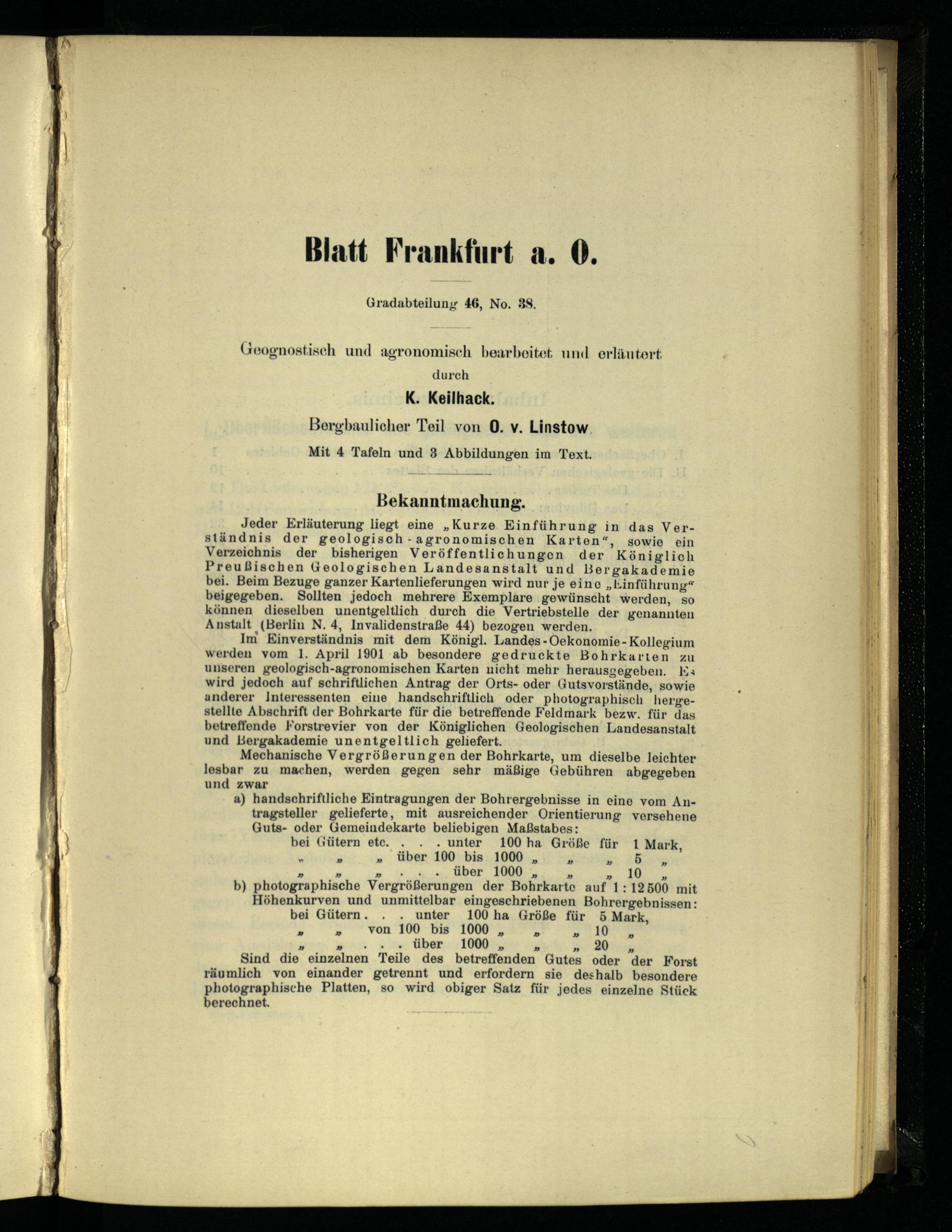 Im Einverständnis mit dem Königl. Landes-Oekonomie-Kollegium werden vom 1. April 1901 ab besondere gedruckte Bohrkarten zu unseren geologisch-agronomischen Karten nicht mehr herausgegeben. Es wird jedoch auf schriftlichen Antrag der Orts- oder Gutsvorstände, sowie anderer Interessenten eine handschriftlich oder photographisch hergestellte Abschrift der Bohrkarte für die betreffende Feldmark bezw. für das betreffende Forstrevier von der Königlichen Geologischen Landesanstalt und Bergakademie unentgeltlich geliefert.