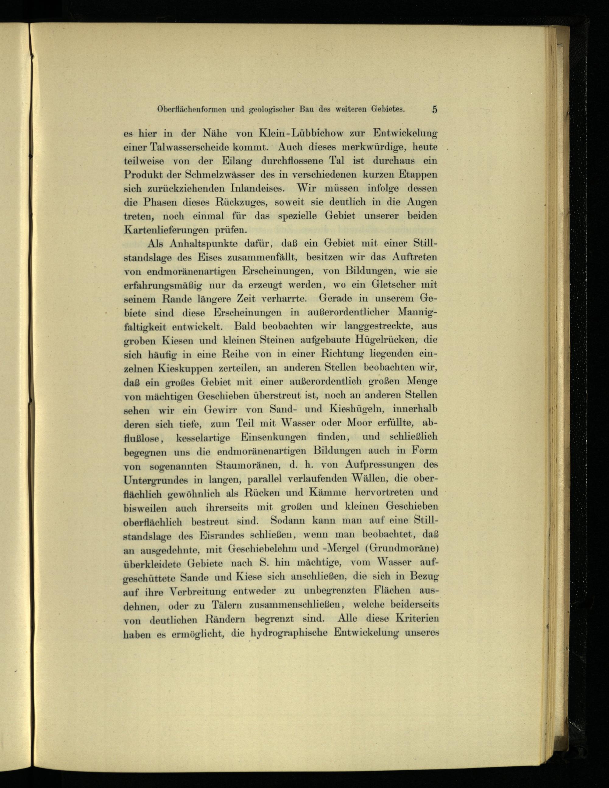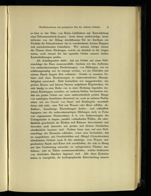 Als Anhaltspunkte dafür, daß ein Gebiet mit einer Stillstandslage des Eises zusammenfällt, besitzen wir das Auftreten von endmoränenartigen Erscheinungen, von Bildungen, wie sie erfahrungsmäßig nur da erzeugt werden, wo ein Gletscher mit seinem Rande längere Zeit verharrte. Gerade in unserem Gebiete sind diese Erscheinungen in außerordentlicher Mannigfaltigkeit entwickelt. Bald beobachten wir langgestreckte, aus groben Kiesen und kleinen Steinen aufgebaute Hügelrücken, die sich häufig in eine Reihe von in einer Richtung liegenden einzelnen Kieskuppen zerteilen, an anderen Stellen beobachten wir, daß ein großes Gebiet mit einer außerordentlich großen Menge von mächtigen Geschieben überstreut ist, noch an anderen Stellen sehen wir ein Gewirr von Sand- und Kieshügeln, innerhalb deren sich tiefe, zum Teil mit Wasser oder Moor erfüllte, abflußlose, kesselartige Einsenkungen finden, und schließlich begegnen uns die endmoränenartigen Bildungen auch in Form von sogenannten Staumoränen, d. h. von Aufpressungen des Untergrundes in langen, parallel verlaufenden Wällen, die oberflächlich gewöhnlich als Rücken und Kämme hervortreten und bisweilen auch ihrerseits mit großen und kleinen Geschieben oberflächlich bestreut sind. Sodann kann man auf eine Stillstandslage des Eisrandes schließen, wenn man beobachtet, daß an ausgedehnte, mit Geschiebelehm und -Mergel (Grundmoräne) überkleidete Gebiete nach S. hin mächtige, vom Wasser auf- geschüttete Sande und Kiese sich anschließen, die sich in Bezug auf ihre Verbreitung entweder zu unbegrenzten Flächen ausdehnen, oder zu Tälern zusammenschließen, welche beiderseits von deutlichen Rändern begrenzt sind. Alle diese Kriterien haben es ermöglicht, die hydrographische Entwickelung unseres