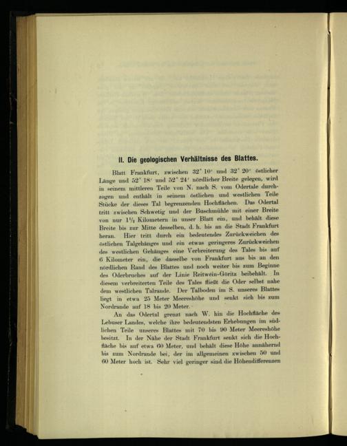 Blatt Frankfurt , zwischen 32° 10' und 32° 20' östlicher Länge und 52° 18' und 52° 24' nördlicher Breite gelegen, wird in seinem mittleren Teile von N. nach S. vom Odertale durchzogen und enthält in seinem östlichen und westlichen Teile Stücke der dieses Tal begrenzenden Hochflächen. Das Odertal tritt zwischen Schwetig und der Buschmühle mit einer Breite von nur 1 1/2 Kilometern in unser Blatt ein, und behält diese Breite bis zur Mitte desselben, d. h. bis an die Stadt Frankfurt heran. Hier tritt durch ein bedeutendes Zurückweichen des östlichen Talgehänges und ein etwas geringeres Zurückweichen des westlichen Gehänges eine Verbreiterung des Tales bis auf 6 Kilometer ein, die dasselbe von Frankfurt aus bis an den nördlichen Rand des Blattes und noch weiter bis zum Beginne des Oderbruches auf der Linie Reitwein-Göritz beibehält. In diesem verbreiterten Teile des Tales fließt die Oder selbst nahe dem westlichen Talrande. Der Talboden im S. unseres Blattes liegt in etwa 25 Meter Meereshöhe und senkt sich bis zum Nordrande auf 18 bis 20 Meter.