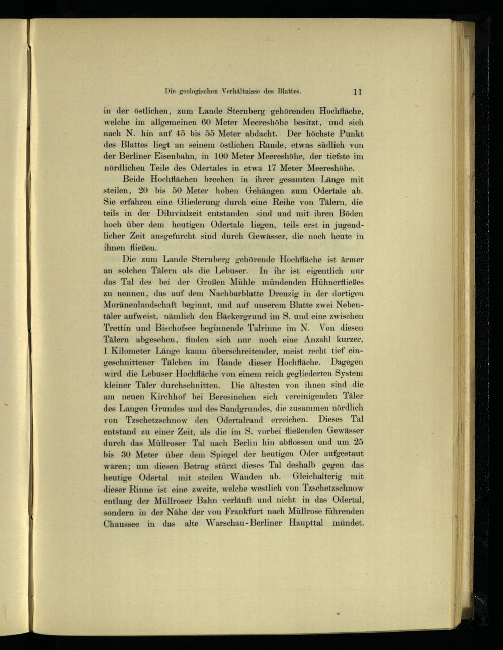 Die zum Lande Sternberg gehörende Hochfläche ist ärmer an solchen Tälern als die Lebuser. In ihr ist eigentlich nur das Tal des bei der Großen Mühle mündenden Hühnerfließes zu nennen, das auf dem Nachbarblatte Drenzig in der dortigen Moränenlandschaft beginnt, und auf unserem Blatte zwei Nebentäler aufweist, nämlich den Bäckergrund im S. und eine zwischen Trettin und Bischofsee beginnende Talrinne im N. Von diesen Tälern abgesehen, finden sich nur noch eine Anzahl kurzer, 1 Kilometer Länge kaum überschreitender, meist recht tief eingeschnittener Tälchen im Rande dieser Hochfläche. Dagegen wird die Lebuser Hochfläche von einem reich gegliederten System kleiner Täler durchschnitten. Die ältesten von ihnen sind die am neuen Kirchhof bei Beresinchen sich vereinigenden Täler des Langen Grundes und des Sandgrundes, die zusammen nördlich von Tzschetzschnow den Odertalrand erreichen. Dieses Tal entstand zu einer Zeit, als die im S. vorbei fließenden Gewässer durch das Müllroser Tal nach Berlin hin abflossen und um 25 bis 30 Meter über dem Spiegel der heutigen Oder aufgestaut waren; um diesen Betrag stürzt dieses Tal deshalb gegen das heutige Odertal mit steilen Wänden ab. Gleichalterig mit dieser Rinne ist eine zweite, welche westlich von Tzschetzschnow entlang der Müllroser Bahn verläuft und nicht in das Odertal, sondern in der Nähe der von Frankfurt nach Müllrose führenden Chaussee in das alte Warschau -Berliner Haupttal mündet.