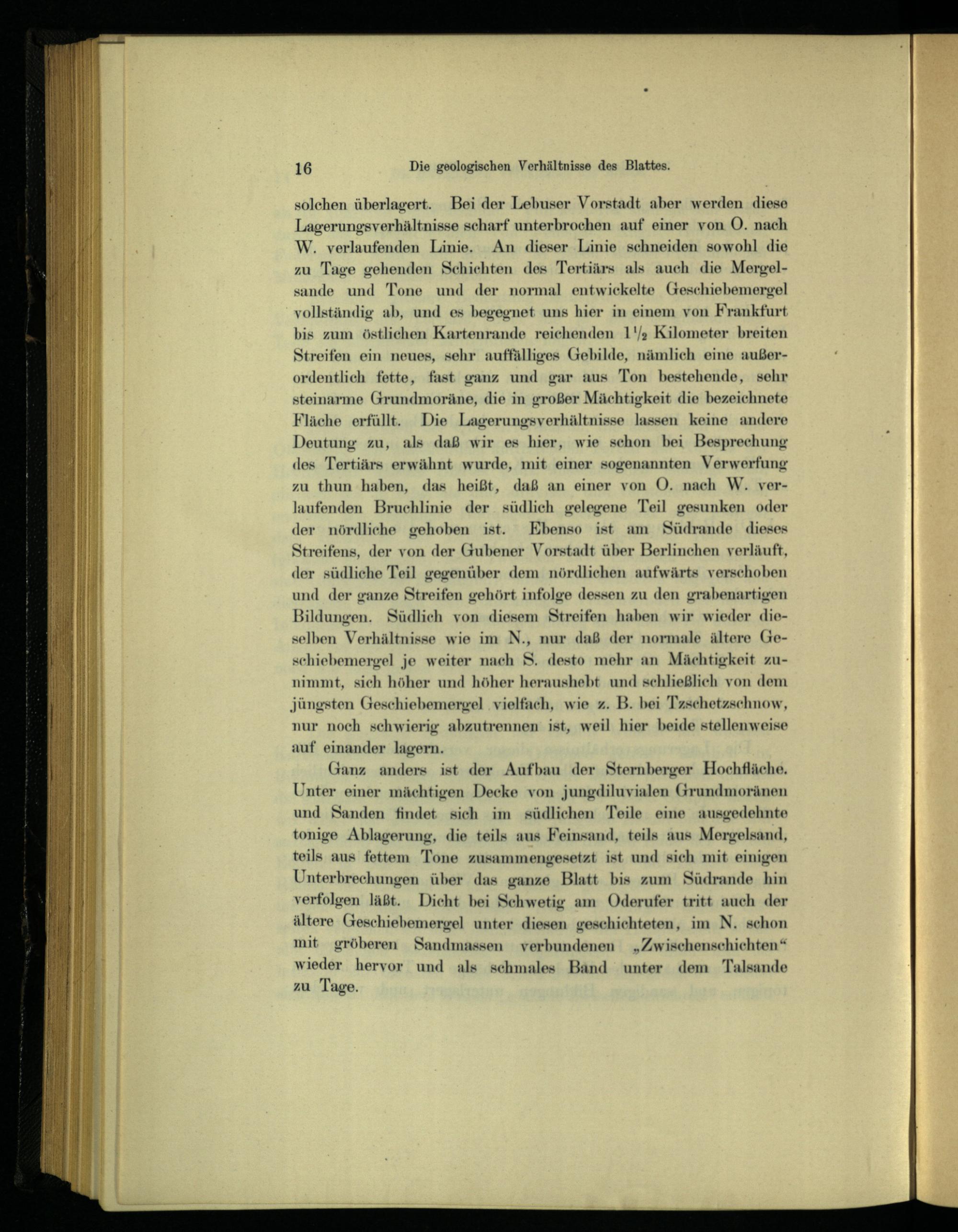 solchen überlagert. Bei der Lebuser Vorstadt aber werden diese Lagerungsverhältnisse scharf unterbrochen auf einer von 0. nach W. verlaufenden Linie. An dieser Linie schneiden sowohl die zu Tage gehenden Schichten des Tertiärs als auch die Mergel- sande und Tone und der normal entwickelte Geschiebemergel vollständig ab, und es begegnet uns hier in einem von Frankfurt bis zum östlichen Kartenrande reichenden 1 1/2 Kilometer breiten Streifen ein neues, sehr auffälliges Gebilde, nämlich eine außerordentlich fette, fast ganz und gar aus Ton bestehende, sehr steinarme Grundmoräne, die in großer Mächtigkeit die bezeichnete Fläche erfüllt. Die Lagerungsverhältnisse lassen keine andere Deutung zu, als daß wir es hier, wie schon bei Besprechung des Tertiärs erwähnt wurde, mit einer sogenannten Verwerfung zu thun haben, das heißt, daß an einer von O. nach W. verlaufenden Bruchlinie der südlich gelegene Teil gesunken oder der nördliche gehoben ist. Ebenso ist am Südrande dieses Streifens, der von der Gubener Vorstadt über Berlinchen verläuft, der südliche Teil gegenüber dem nördlichen aufwärts verschoben und der ganze Streifen gehört infolge dessen zu den grabenartigen Bildungen. Südlich von diesem Streifen haben wir wieder dieselben Verhältnisse wie im N., nur daß der normale ältere Ge- schiebemergel je weiter nach S. desto mehr an Mächtigkeit zunimmt, sich höher und höher heraushebt und schließlich von dem jüngsten Geschiebemergel vielfach, wie z. B. bei Tzschetzschnow, nur noch schwierig abzutrennen ist, weil hier beide stellenweise auf einander lagern.