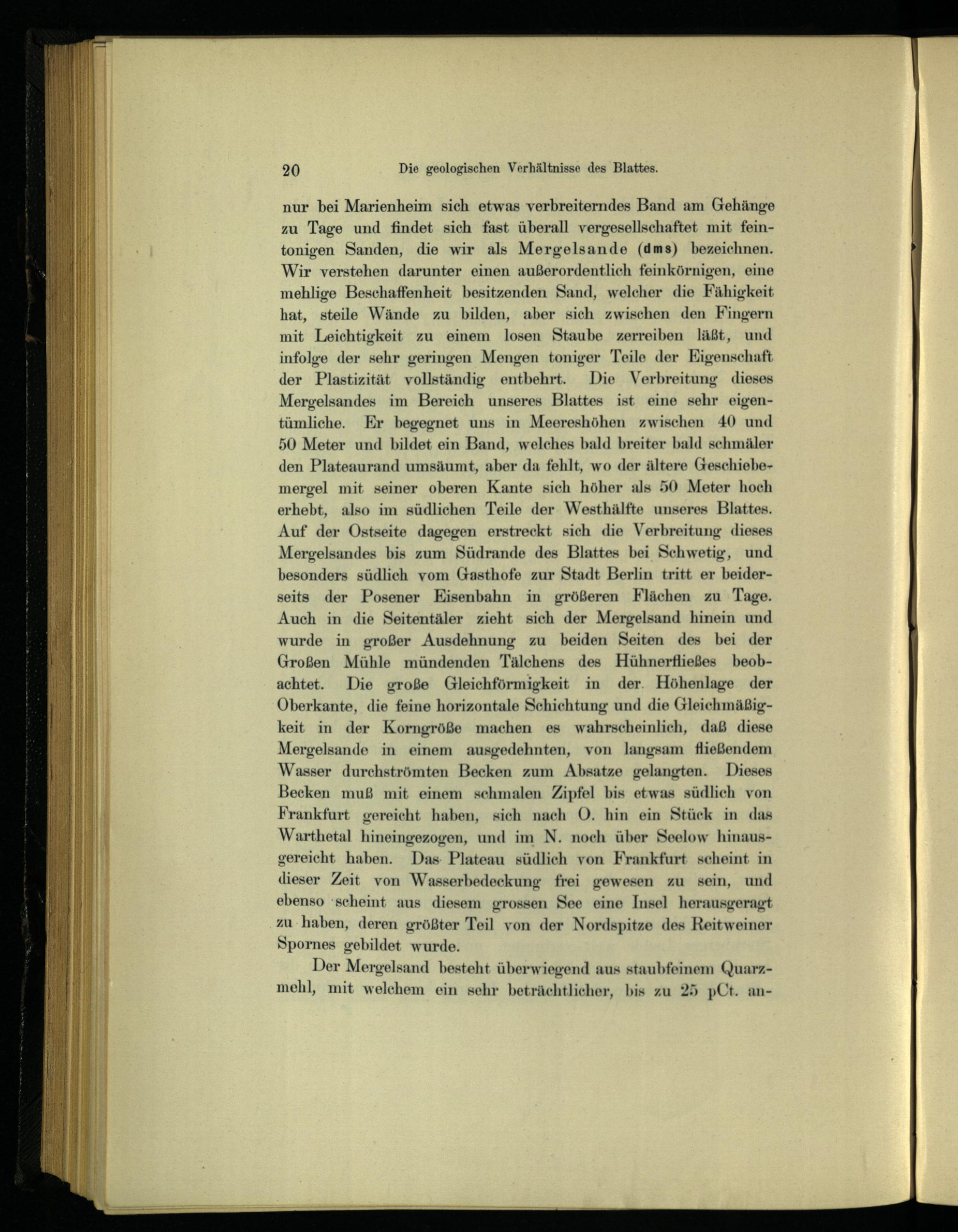 nur bei Marienheim sich etwas verbreiterndes Band am Gehänge zu Tage und findet sich fast überall vergesellschaftet mit fein- tonigen Sanden, die wir als Mergelsande (dms) bezeichnen. Wir verstehen darunter einen außerordentlich feinkörnigen, eine mehlige Beschaffenheit besitzenden Sand, welcher die Fähigkeit, hat, steile Wände zu bilden, aber sich zwischen den Fingern mit Leichtigkeit zu einem losen Staube zerreiben läßt, und infolge der sehr geringen Mengen toniger Teile der Eigenschaft der Plastizität vollständig entbehrt. Die Verbreitung dieses Mergelsandes im Bereich unseres Blattes ist eine sehr eigentümliche. Er begegnet uns in Meereshöhen zwischen 40 und 50 Meter und bildet ein Band, welches bald breiter bald schmäler den Plateaurand umsäumt, aber da fehlt, wo der ältere Geschiebe- mergel mit seiner oberen Kante sich höher als 50 Meter hoch erhebt, also im südlichen Teile der Westhälfte unseres Blattes. Auf der Ostseite dagegen erstreckt sich die Verbreitung dieses Mergelsandes bis zum Südrande des Blattes bei Schwetig, und besonders südlich vom Gasthofe zur Stadt Berlin tritt er beiderseits der Posener Eisenbahn in größeren Flächen zu Tage. Auch in die Seitentäler zieht sich der Mergelsand hinein und wurde in großer Ausdehnung zu beiden Seiten des bei der Großen Mühle mündenden Tälchens des Hühnerfiießes beobachtet. Die große Gleichförmigkeit in der Höhenlage der Oberkante, die feine horizontale Schichtung und die Gleichmäßigkeit in der Korngröße machen es wahrscheinlich, daß diese Mergelsande in einem ausgedehnten, von langsam fließendem Wasser durchströmten Becken zum Absatze gelangten. Dieses Becken muß mit einem schmalen Zipfel bis etwas südlich von Frankfurt gereicht haben, sich nach O. hin ein Stück in das Warthetal hineingezogen, und im N. noch über Seelow hinausgereicht haben. Das Plateau südlich von Frankfurt scheint in dieser Zeit von Wasserbedeckung frei gewesen zu sein, und ebenso scheint aus diesem grossen See eine Insel herausgeragt zu haben, deren größter Teil von der Nordspitze des Reitweiner Spornes gebildet wurde.