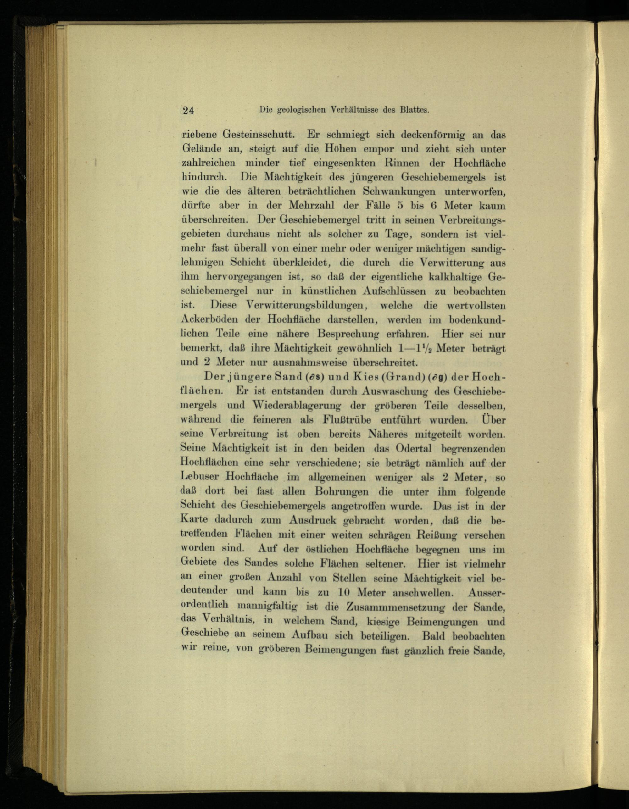 riebene Gesteinsschutt. Er schmiegt sich deckenförmig an das Gelände an, steigt auf die Höhen empor und zieht sich unter zahlreichen minder tief eingesenkten Rinnen der Hochfläche hindurch. Die Mächtigkeit des jüngeren Geschiebemergels ist wie die des älteren beträchtlichen Schwankungen unterworfen, dürfte aber in der Mehrzahl der Fälle 5 bis 6 Meter kaum überschreiten. Der Geschiebemergel tritt in seinen Verbreitungsgebieten durchaus nicht als solcher zu Tage, sondern ist vielmehr fast überall von einer mehr oder weniger mächtigen sandiglehmigen Schicht überkleidet, die durch die Verwitterung aus ihm hervorgegangen ist, so daß der eigentliche kalkhaltige Ge- schiebemergel nur in künstlichen Aufschlüssen zu beobachten ist. Diese Verwitterungsbildungen, welche die wertvollsten Ackerböden der Hochfläche darstellen, werden im bodenkund- lichen Teile eine nähere Besprechung erfahren. Hier sei nur bemerkt, daß ihre Mächtigkeit gewöhnlich 1—1 1/2 Meter beträgt und 2 Meter nur ausnahmsweise überschreitet.
