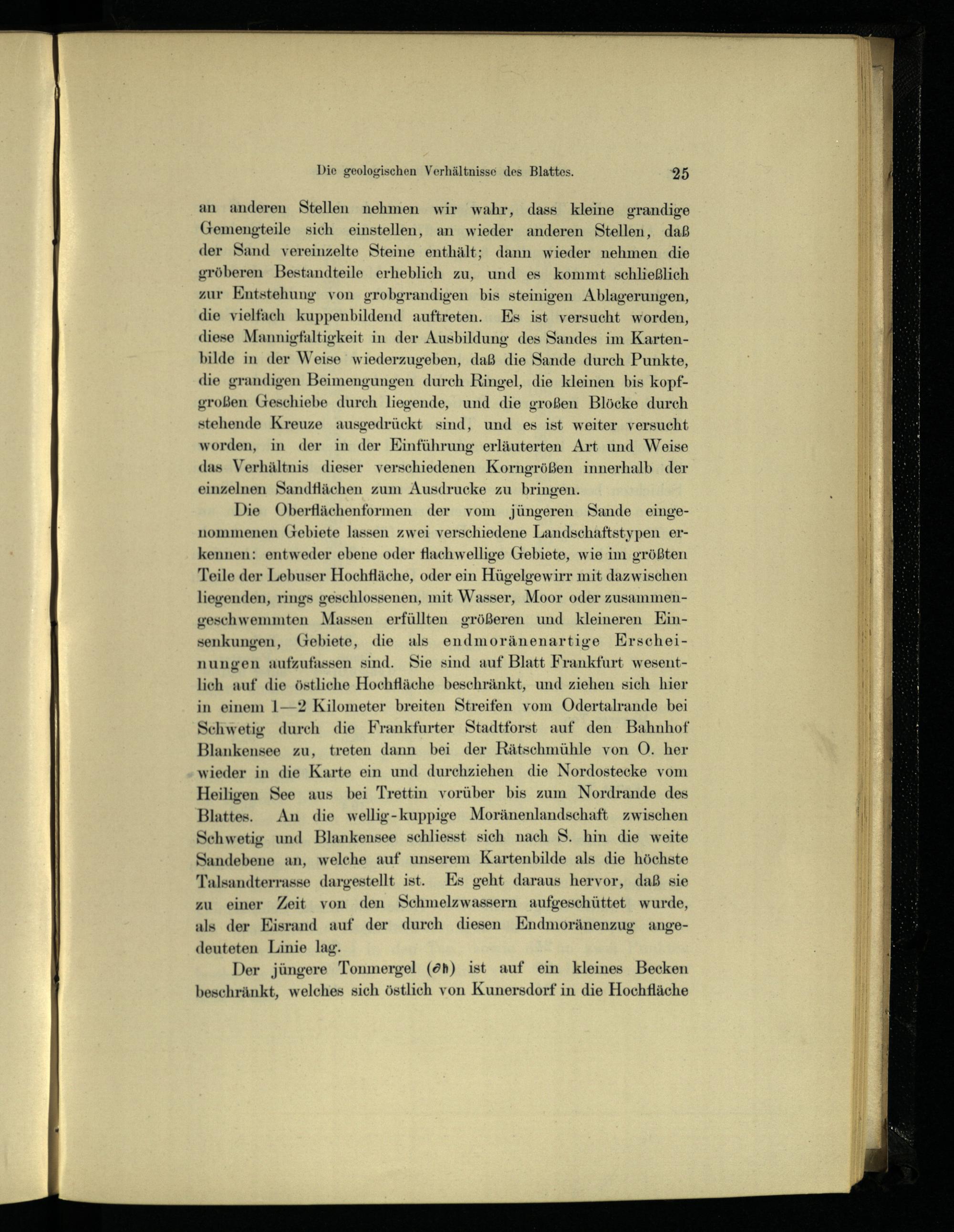 Die Oberflächenformen der vom jüngeren Sande eingenommenen Gebiete lassen zwei verschiedene Landschaftstypen erkennen: entweder ebene oder flachwellige Gebiete, wie im größten Teile der Lebuser Hochfläche, oder ein Hügelgewirr mit dazwischen liegenden, rings geschlossenen, mit Wasser, Moor oder zusammengeschwemmten Massen erfüllten größeren und kleineren Einsenkungen, Gebiete, die als endmoränenartige Erscheinungen aufzufassen sind. Sie sind auf Blatt Frankfurt wesentlich auf die östliche Hochfläche beschränkt, und ziehen sich hier in einem 1—2 Kilometer breiten Streifen vom Odertalrande bei Schwetig durch die Frankfurter Stadtforst auf den Bahnhof Blankensee zu, treten dann bei der Rätschmühle von O. her wieder in die Karte ein und durchziehen die Nordostecke vom Heiligen See aus bei Trettin vorüber bis zum Nordrande des Blattes. An die wellig-kuppige Moränenlandschaft zwischen Schwetig und Blankensee schliesst sich nach S. hin die weite Sandebene an, welche auf unserem Kartenbilde als die höchste Talsandterrasse dargestellt ist. Es geht daraus hervor, daß sie zu einer Zeit von den Schmelzwassern aufgeschüttet wurde, als der Eisrand auf der durch diesen Endmoränenzug ange- deuteten Linie lag.
