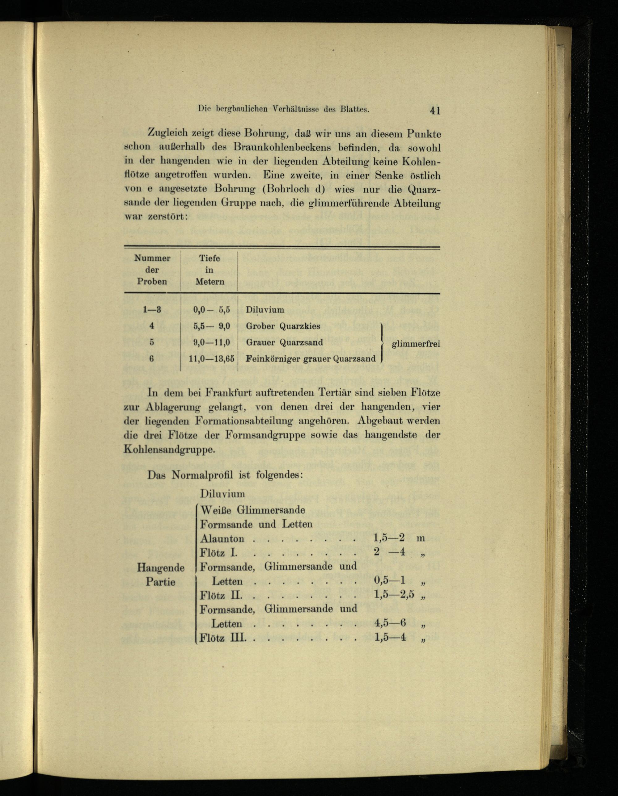 Zugleich zeigt diese Bohrung, daß wir uns an diesem Punkte schon außerhalb des Braunkohlenbeckens befinden, da sowohl in der hangenden wie in der liegenden Abteilung keine Kohlen- flötze angetroffen wurden. Eine zweite, in einer Senke östlich von e angesetzte Bohrung (Bohrloch d) wies nur die Quarzsande der liegenden Gruppe nach, die glimmerführende Abteilung war zerstört: