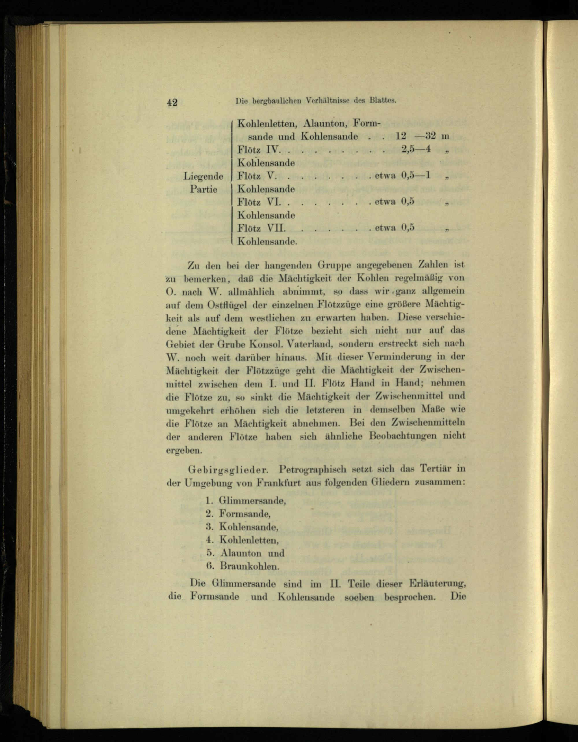 O. nach W. allmählich ahnimmt, so dass wir ganz allgemein auf dem Ostflügel der einzelnen Flötzzüge eine größere Mächtigkeit als auf dem westlichen zu erwarten haben. Diese verschiedene Mächtigkeit der Flötze bezieht sich nicht nur auf das Gebiet der Grube Konsol. Vaterland, sondern erstreckt sich nach W. noch weit darüber hinaus. Mit dieser Verminderung in der Mächtigkeit der Flötzzüge geht die Mächtigkeit der Zwischenmittel zwischen dem I. und II. Flötz Hand in Hand; nehmen die Flötze zu, so sinkt die Mächtigkeit der Zwischenmittel und umgekehrt erhöhen sich die letzteren in demselben Maße wie die Flötze an Mächtigkeit abnehmen. Bei den Zwischenmitteln der anderen Flötze haben sich ähnliche Beobachtungen nicht ergeben.