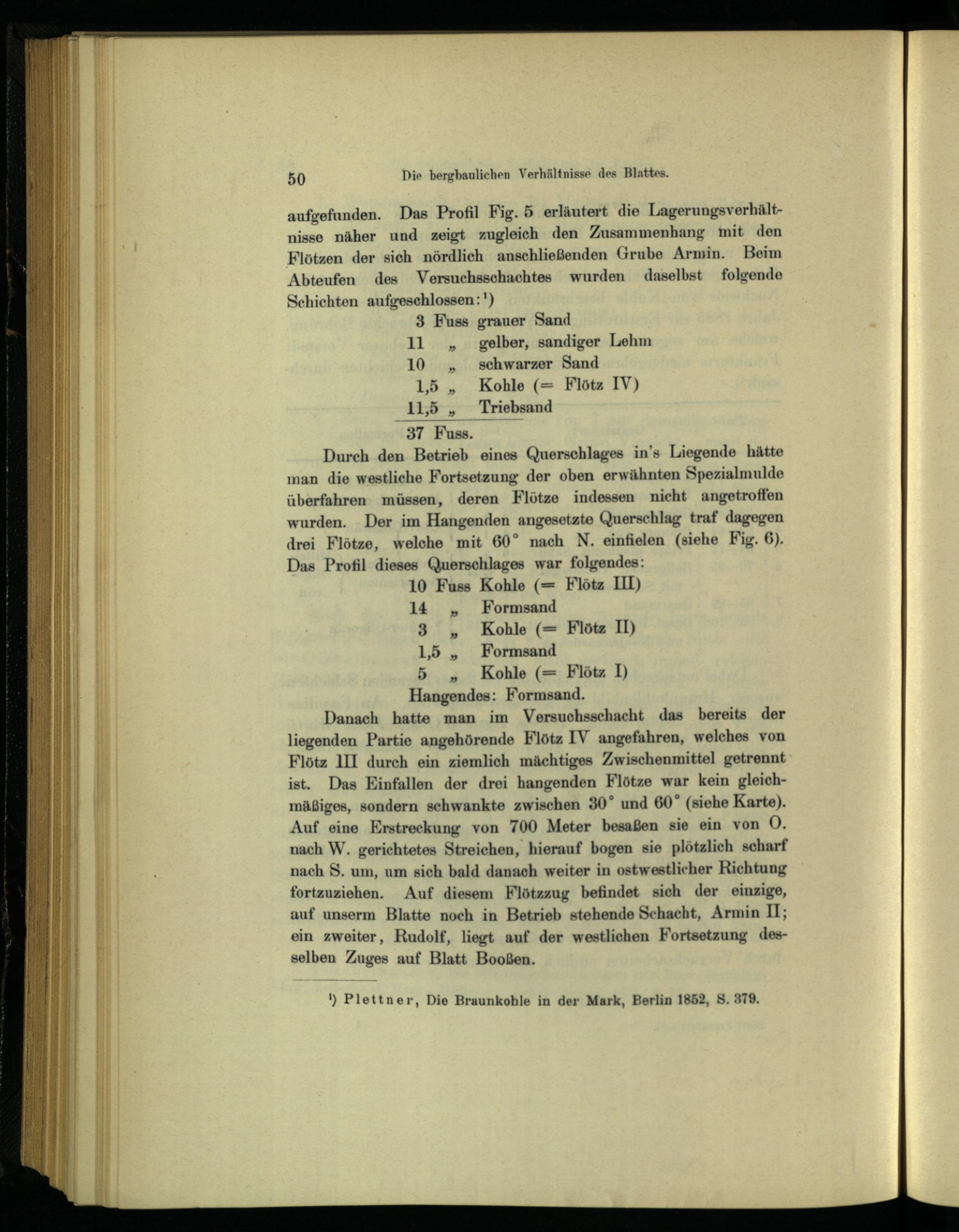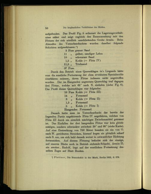 Danach hatte man im Versuchsschacht das bereits der liegenden Partie angehörende Flötz IV angefahren, welches von Flötz III durch ein ziemlich mächtiges Zwischenmittel getrennt ist. Das Einfallen der drei hangenden Flötze war kein gleichmäßiges, sondern schwankte zwischen 30* und 60* (siehe Karte). Auf eine Erstreckung von 700 Meter besaßen sie ein von O. nach W. gerichtetes Streichen, hierauf bogen sie plötzlich scharf nach S. um, um sich bald danach weiter in ostwestlicher Richtung fortzuziehen. Auf diesem Flötzzug befindet sich der einzige, auf unserm Blatte noch in Betrieb stehende Schacht, Armin II; ein zweiter, Rudolf, liegt auf der westlichen Fortsetzung desselben Zuges auf Blatt Booßen .