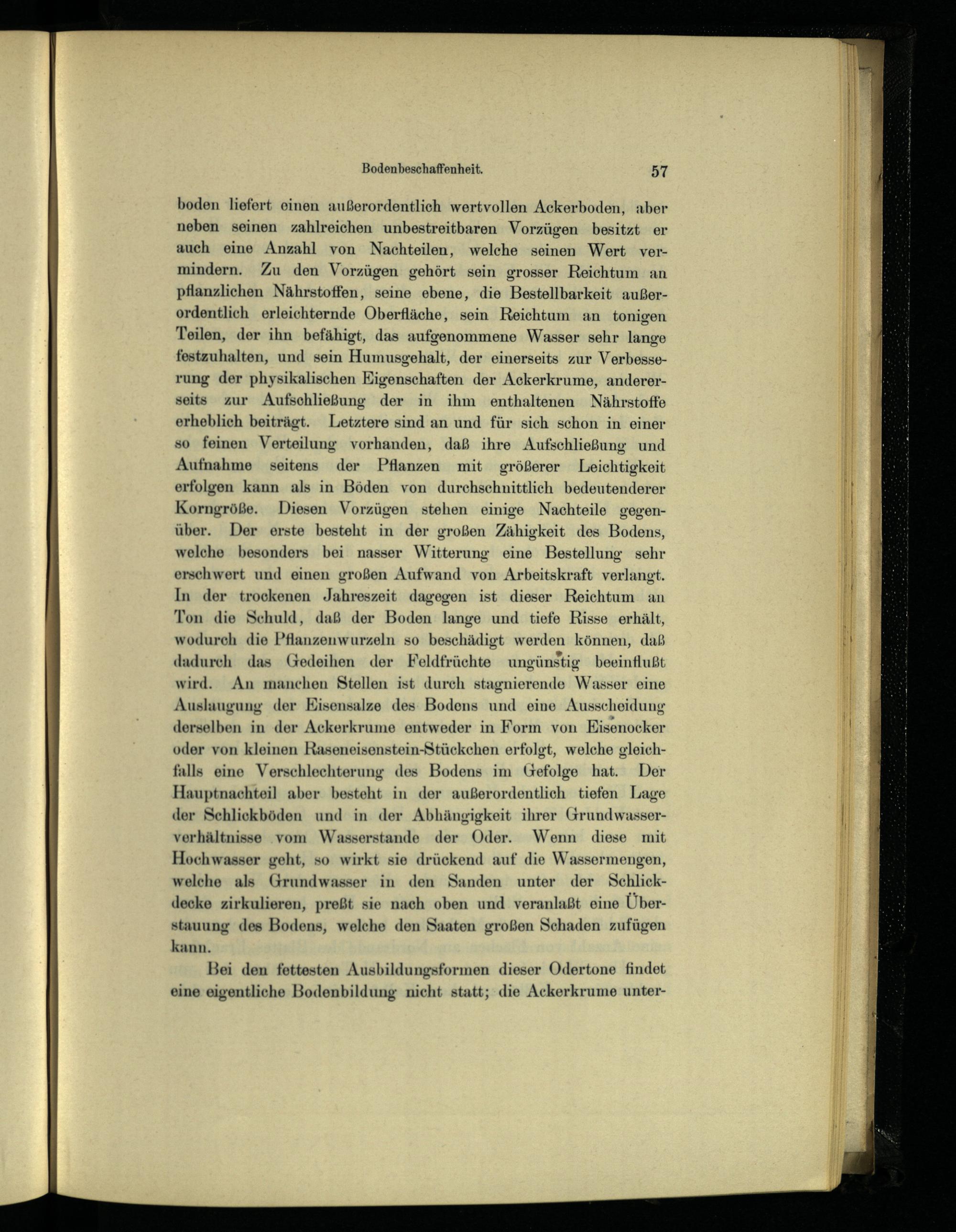 boden liefert einen außerordentlich wertvollen Ackerboden, aber neben seinen zahlreichen unbestreitbaren Vorzügen besitzt er auch eine Anzahl von Nachteilen, welche seinen Wert vermindern. Zu den Vorzügen gehört sein grosser Reichtum an pflanzlichen Nährstoffen, seine ebene, die Bestellbarkeit außerordentlich erleichternde Oberfläche, sein Reichtum an tonigen Teilen, der ihn befähigt, das aufgenommene Wasser sehr lange festzuhalten, und sein Humusgehalt, der einerseits zur Verbesserung der physikalischen Eigenschaften der Ackerkrume, andererseits zur Aufschließung der in ihm enthaltenen Nährstoffe erheblich beiträgt. Letztere sind an und für sich schon in einer so feinen Verteilung vorhanden, daß ihre Aufschließung und Aufnahme seitens der Pflanzen mit größerer Leichtigkeit erfolgen kann als in Böden von durchschnittlich bedeutenderer Korngröße. Diesen Vorzügen stehen einige Nachteile gegenüber. Der erste besteht in der großen Zähigkeit des Bodens, welche besonders bei nasser Witterung eine Bestellung sehr erschwert und einen großen Aufwand von Arbeitskraft verlangt, ln der trockenen Jahreszeit dagegen ist dieser Reichtum an Ton die Schuld, daß der Boden lange und tiefe Risse erhält, wodurch die Pflanzenwurzeln so beschädigt werden können, daß dadurch das Gedeihen der Feldfrüchte ungünstig beeinflußt wird. An manchen Stellen ist durch stagnierende Wasser eine Auslaugung der Eisensalze des Bodens und eine Ausscheidung derselben in der Ackerkrume entweder in Form von Eisenocker oder von kleinen Raseneisenstein-Stückchen erfolgt, welche gleichfalls eine Verschlechterung des Bodens im Gefolge hat. Der Hauptnachteil aber besteht in der außerordentlich tiefen Lage der Schlickboden und in der Abhängigkeit ihrer Grundwasser- vorhältnisse vom Wasserstande der Oder. Wenn diese mit Hochwasser geht, so wirkt sie drückend auf die Wassermengen, welche als Grundwasser in den Sanden unter der Schlickdecke zirkulieren, preßt sie nach oben und veranlaßt eine Überstauung des Bodons, welche den Saaten großen Schaden zufügen kann.