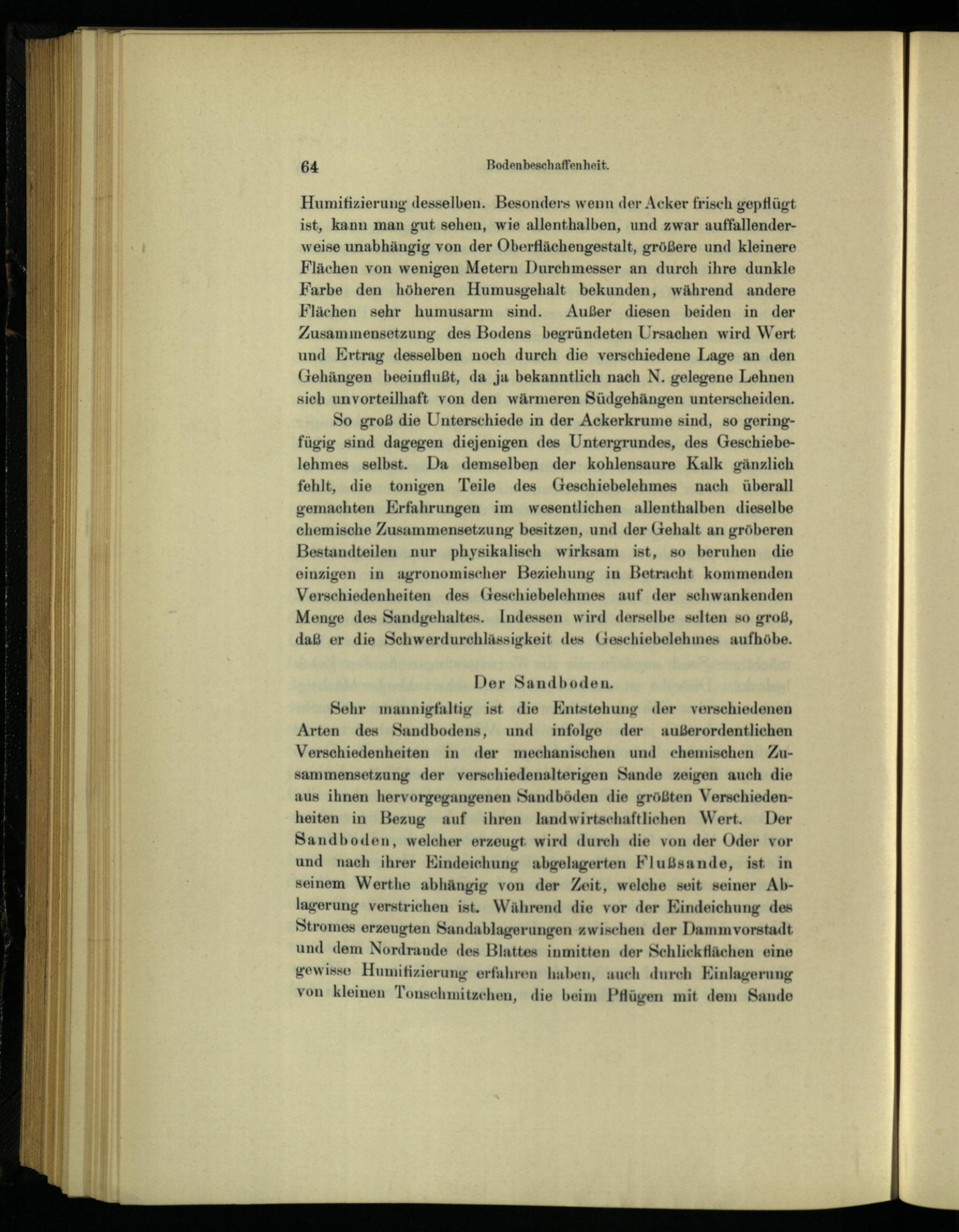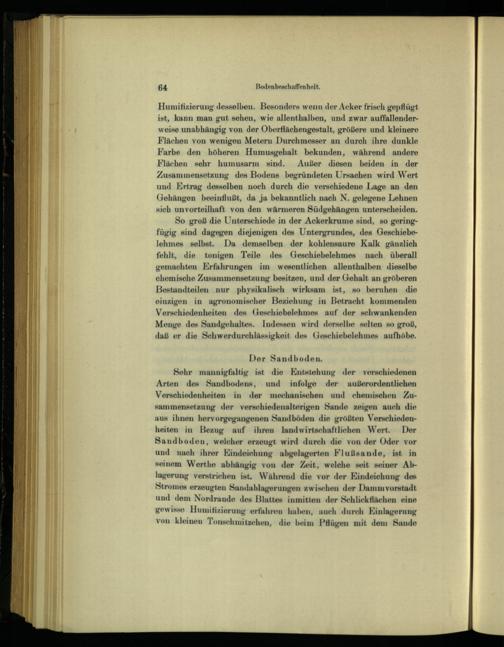 Sehr mannigfaltig ist die Entstehung der verschiedenen Arten des Sandbodens, und infolge der außerordentlichen Verschiedenheiten in der mechanischen und chemischen Zusammensetzung der verschiedenalterigen Sande zeigen auch die aus ihnen hervorgegangenen Sandböden die größten Verschiedenheiten in Bezug auf ihren landwirtschaftlichen Wert. Der Sandboden, welcher erzeugt wird durch die von der Oder vor und nach ihrer Eindeichung abgelagerten Flußsande, ist in seinem Werthe abhängig von der Zeit, welche seit seiner Ablagerung verstrichen ist. Während die vor der Eindeichung des Stromes erzeugten Sandablagerungen zwischen der Dammvorstadt und dem Nordrande des Blattes inmitten der Schlickflächen eine gewisse Humifizierung erfuhren haben, auch durch Einlagerung von kleinen Tonschmitzchen, die beim Pflügen mit dem Sande