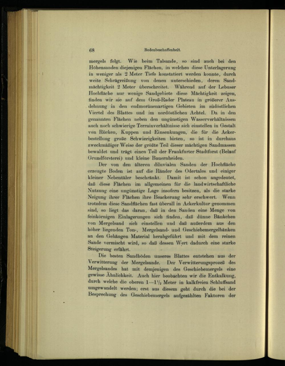 mergels folgt. Wie beim Talsande, so sind auch bei den Höhensanden diejenigen Flächen, in welchen diene Unterlagerung in weniger als 2 Meter Tiefe konstatiert werden konnte, durch weite Schrägreißung von denen unterschieden, deren Sand- mächtigkeit 2 Meter überschreitet. Wahrend auf der Lebuser Hochfläche nur wenige Sandgebiete diese Mächtigkeit zeigen, finden wir sie auf dem Groß-Rader Plateau in größerer Ausdehnung in den endmoränenartigen Gebieten im südöstlichen Viertel des Blattes und im nordöstlichen Achtel. Da in den genannten Flächen neben den ungünstigen Wasserverhältnissen auch noch schwierige Terrainverhältnisse sich einstellen in Gestalt von Rücken, Kuppen und Einsenkungen, die für die Acker- bestellung große Schwierigkeiten bieten, so ist in durchaus zweckmäßiger Weise der größte Teil dieser mächtigen Sandmassen bewaldet und trägt einen Teil der Frankfurter Stadtforst (Belauf Grundförsterei) und kleine Bauernheiden.