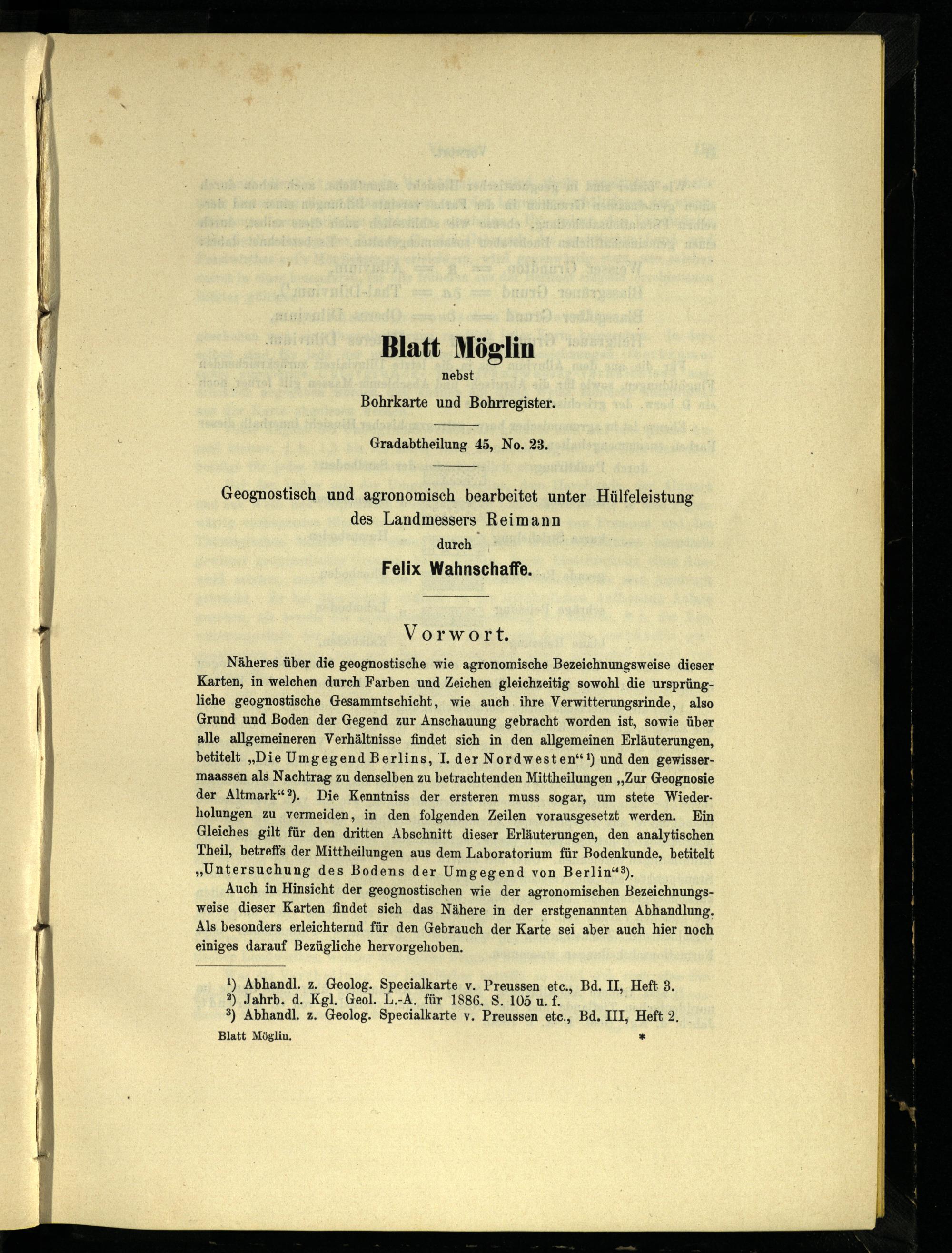 Näheres über die geognostische wie agronomische Bezeichnungsweise dieser Karten, in welchen durch Farben und Zeichen gleichzeitig sowohl die ursprüngliche geognostische Gesammtschicht, wie auch ihre Verwitterungsrinde, also Grund und Boden der Gegend zur Anschauung gebracht worden ist, sowie über alle allgemeineren Verhältnisse findet sich in den allgemeinen Erläuterungen, betitelt „Die Umgegend Berlins , I. der Nordwesten“1) und den gewisser- maassen als Nachtrag zu denselben zu betrachtenden Mittheilungen „Zur Geognosie der Altmark" ²). D ie Kenntniss der ersteren muss sogar, um stete Wiederholungen zu vermeiden, in den folgenden Zeilen vorausgesetzt werden. Ein Gleiches gilt für den dritten Abschnitt dieser Erläuterungen, den analytischen Theil, betreffs der Mittheilungen aus dem Laboratorium für Bodenkunde, betitelt „Untersuchung des Bodens der Umgegend von Berlin “ ³ ).