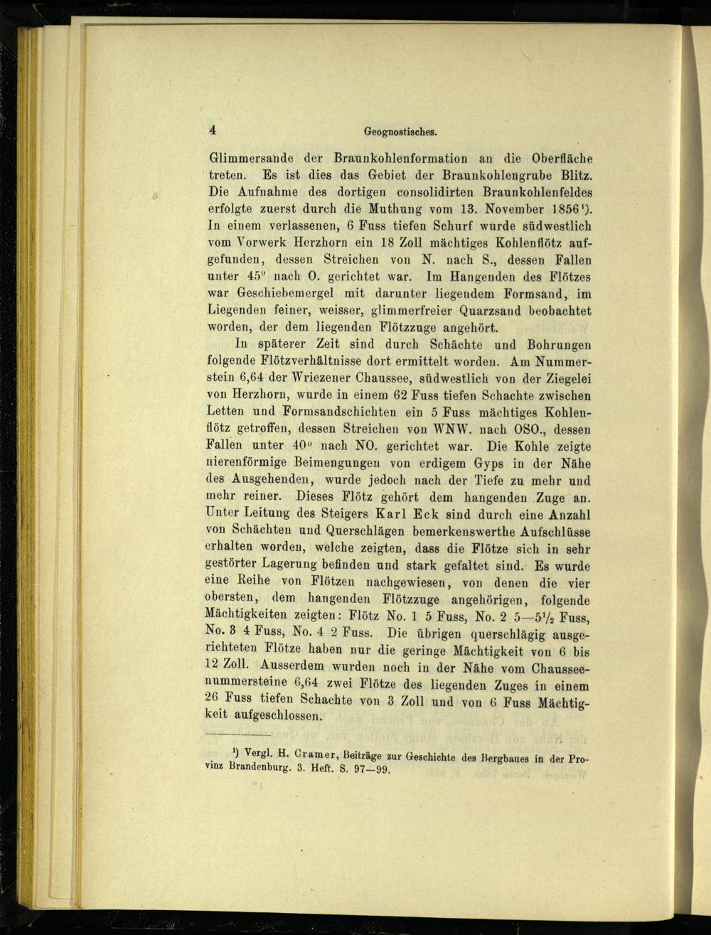 In späterer Zeit sind durch Schächte und Bohrungen folgende Flötzverhältnisse dort ermittelt worden. Am Nummerstein 6,64 der Wriezener Chaussee, südwestlich von der Ziegelei von Herzhorn , wurde in einem 62 Fuss tiefen Schachte zwischen Letten und Formsandschichten ein 5 Fuss mächtiges Kohlenflötz getroffen, dessen Streichen von WNW. nach OSO., dessen Fallen unter 40° nach NO. gerichtet war. Die Kohle zeigte nierenförmige Beimengungen von erdigem Gyps in der Nähe des Ausgehenden, wurde jedoch nach der Tiefe zu mehr und mehr reiner. Dieses Flötz gehört dem hangenden Zuge an. Unter Leitung des Steigers Karl Eck sind durch eine Anzahl von Schächten und Querschlägen bemerkenswerthe Aufschlüsse erhalten worden, welche zeigten, dass die Flötze sich in sehr gestörter Lagerung befinden und stark gefaltet sind. Es wurde eine Reihe von Flötzen nachgewiesen, von denen die vier obersten, dem hangenden Flötzzuge angehörigen, folgende Mächtigkeiten zeigten: Flötz No. 1 5 Fuss, No. 2 5 — 572 Fuss, No. 3 4 Fuss, No. 4 2 Fuss. Die übrigen querschlägig ausgerichteten Flötze haben nur die geringe Mächtigkeit von 6 bis 12 Zoll. Ausserdem wurden noch in der Nähe vom Chausseenummersteine 6,64 zwei Flötze des liegenden Zuges in einem 26 Fuss tiefen Schachte von 3 Zoll und von 6 Fuss Mächtigkeit aufgeschlossen.
