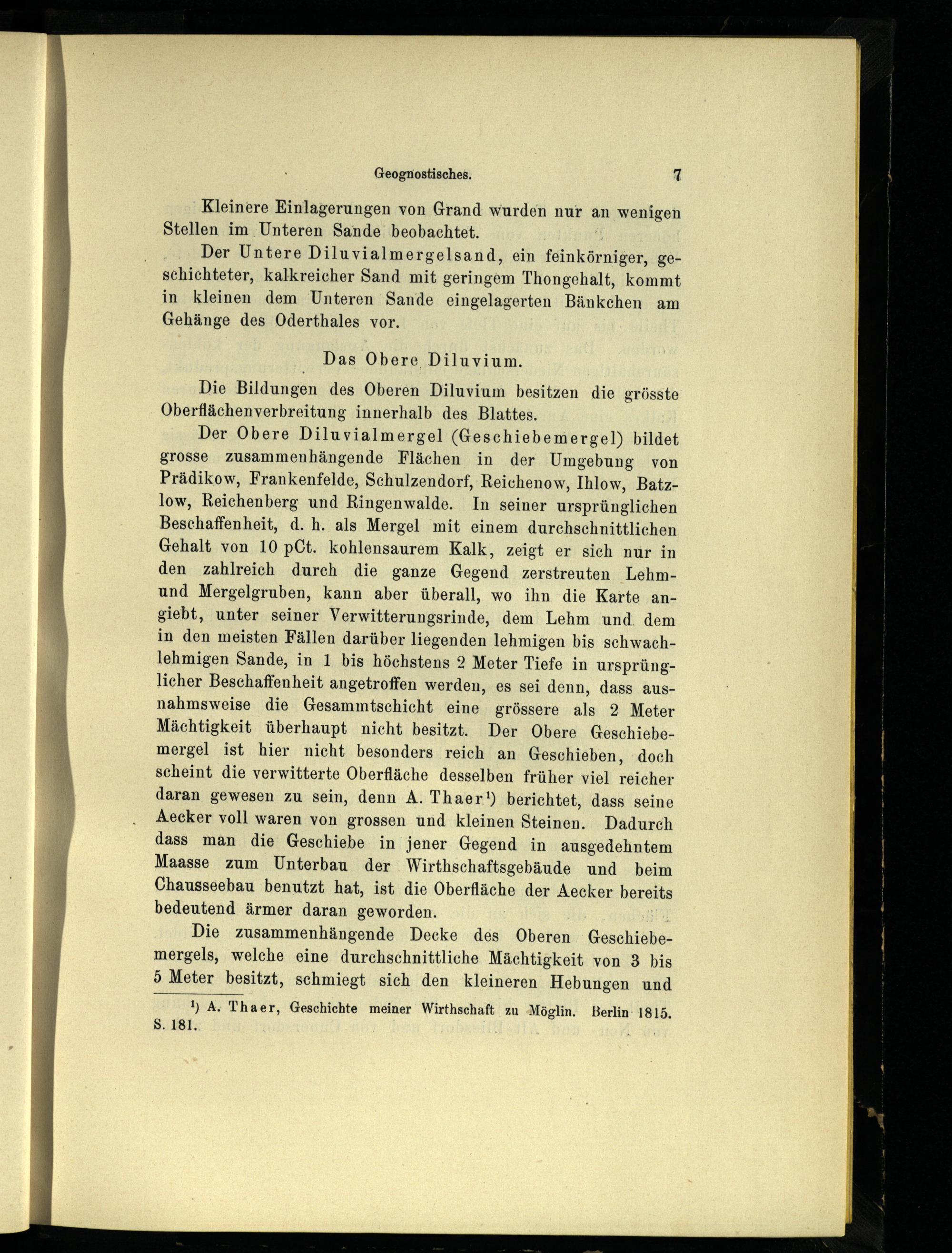 Der Obere Diluvialmergel (Geschiebemergel) bildet grosse zusammenhängende Flächen in der Umgebung von Prädikow, Frankenfelde, Schulzendorf, Reichenow , Ihlow , Batz- low, Reichenberg und Ringenwalde. In seiner ursprünglichen Beschaffenheit, d. h. als Mergel mit einem durchschnittlichen Gehalt von 10 pCt. kohlensaurem Kalk, zeigt er sich nur in den zahlreich durch die ganze Gegend zerstreuten Lehm- und Mergelgruben, kann aber überall, wo ihn die Karte an- giebt, unter seiner Verwitterungsrinde, dem Lehm und dem in den meisten Fällen darüber liegenden lehmigen bis schwachlehmigen Sande, in 1 bis höchstens 2 Meter Tiefe in ursprünglicher Beschaffenheit angetrolfen werden, es sei denn, dass ausnahmsweise die Gesammtschicht eine grössere als 2 Meter Mächtigkeit überhaupt nicht besitzt. Der Obere Geschiebemergel ist hier nicht besonders reich an Geschieben, doch scheint die verwitterte Oberfläche desselben früher viel reicher daran gewesen zu sein, denn A. Thaer 1 ) berichtet, dass seine Aecker voll waren von grossen und kleinen Steinen. Dadurch dass man die Geschiebe in jener Gegend in ausgedehntem Maasse zum Unterbau der Wirthschaftsgebäude und beim Chausseebau benutzt hat, ist die Oberfläche der Aecker bereits bedeutend ärmer daran geworden.