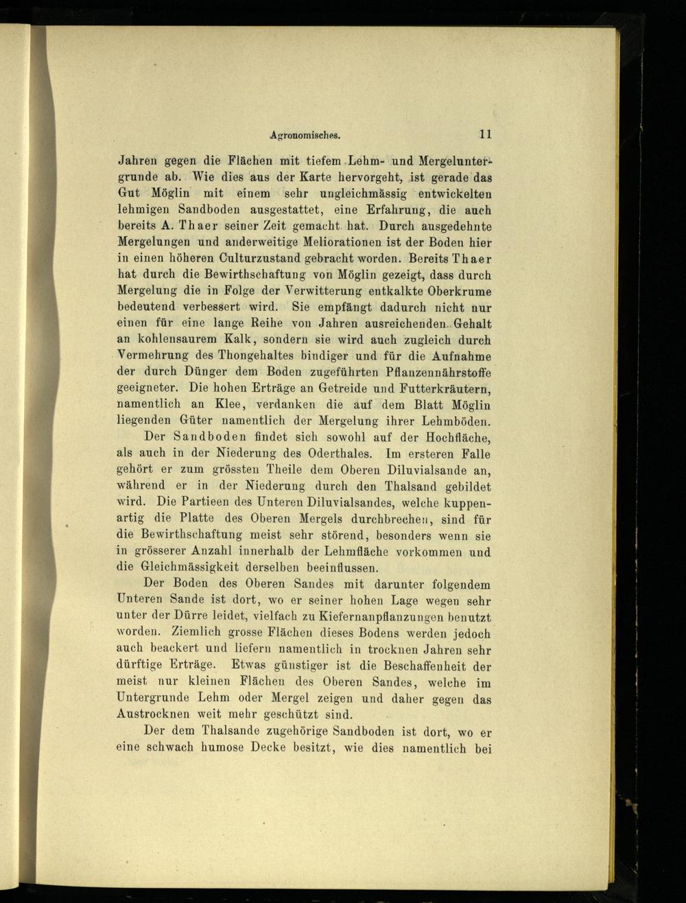 Jahren gegen die Flächen mit tiefem Lehm- und Mergeluntergrunde ab. Wie dies aus der Karte hervorgeht, ist gerade das Gut Möglin mit einem sehr ungleichmässig entwickelten lehmigen Sandboden ausgestattet, eine Erfahrung, die auch bereits A. Thaer seinerzeit gemacht hat. Durch ausgedehnte Mergelungen und anderweitige Meliorationen ist der Boden hier in einen höheren Culturzustand gebracht worden. Bereits Thaer hat durch die Bewirtschaftung von Möglin gezeigt, dass durch Mergelung die in Folge der Verwitterung entkalkte Oberkrume bedeutend verbessert wird. Sie empfängt dadurch nicht nur einen für eine lange Reihe von Jahren ausreichenden Gehalt an kohlensaurem Kalk, sondern sie wird auch zugleich durch Vermehrung des Thongehaltes bindiger und für die Aufnahme der durch Dünger dem Boden zugeführten Pflanzennährstoffe geeigneter. Die hohen Erträge an Getreide und Futterkräutern, namentlich an Klee , verdanken die auf dem Blatt Möglin liegenden Güter namentlich der Mergelung ihrer Lehmböden.