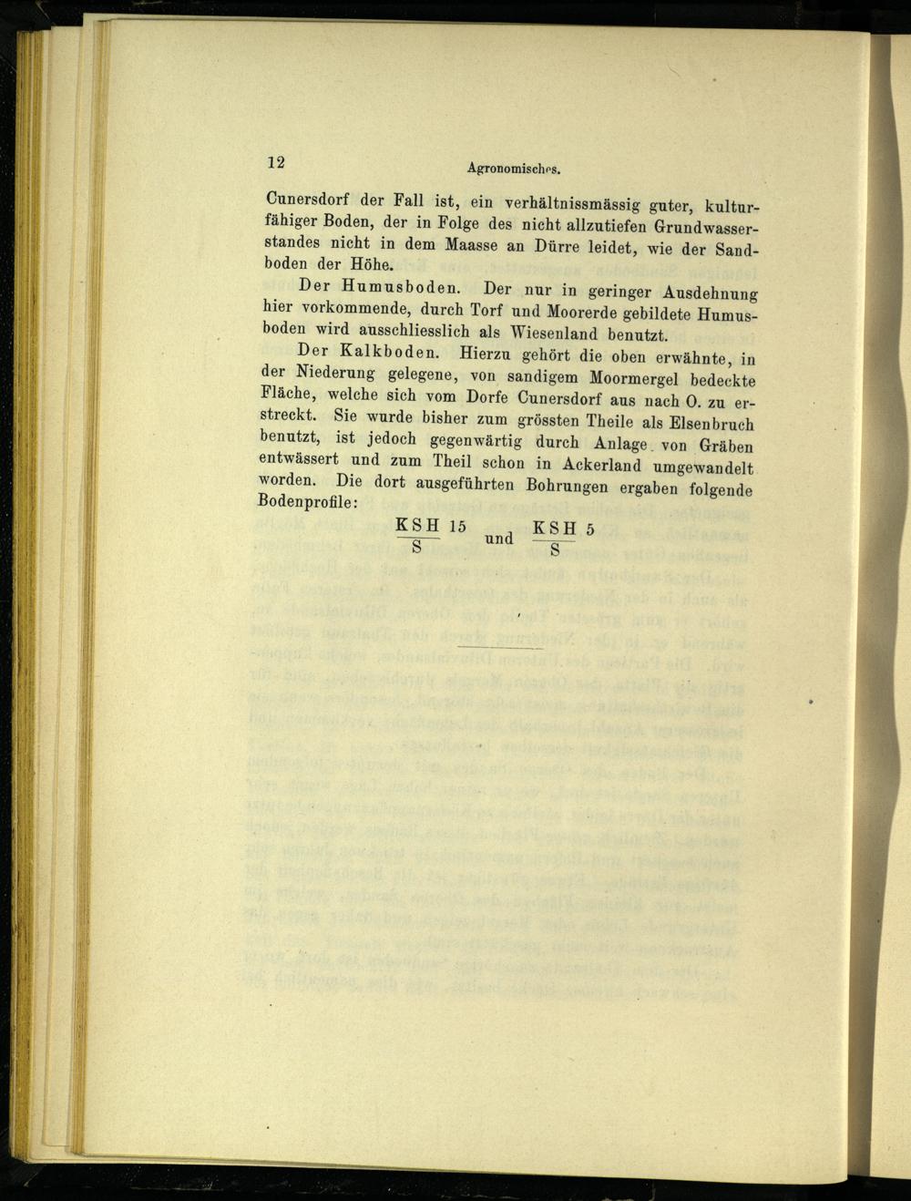 Der Kalkboden. Hierzu gehört die oben erwähnte, in der Niederung gelegene, von sandigem Moormergel bedeckte Fläche, welche sich vom Dorfe Cunersdorf aus nach 0. zu erstreckt. Sie wurde bisher zum grössten Theile als Elsenbruch benutzt, ist jedoch gegenwärtig durch Anlage von Gräben entwässert und zum Theil schon in Ackerland umgewandelt worden. Die dort ausgeführten Bohrungen ergaben folgende Bodenprofile: