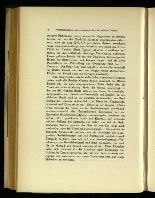 mehrere Richtungen, jedoch kommt im allgemeinen ein Streifen heraus, der sich der Nord-Süd-Richtung einigermaßen nähert; man wird sie dem NW.-SO. gerichteten System zurechnen, wenn man berücksichtigt, daß südöstlich von ihnen am Kreuz- Pfuhl bei Batzlow (Blatt Tamsel) ähnliche Kies-Berge auf- treten, die eine auffallende As-artige Verzweigung aufweisen. Ferner gehören hierhin die aus der Umgebung herausragenden Höhen des Spitz-Berges und Langen Berges, und als deren Parallelkette der Pahls-Berg und Grafenberg SSO. von Gr. Cammin. Der Pahls-Berg wird mit, 09 m Meereshöhe innerhalb des Blattes Tamsel nur noch von einigen wenig ausgedehnten Flächen bei Zerbicke um ein Geringes übertroffen.