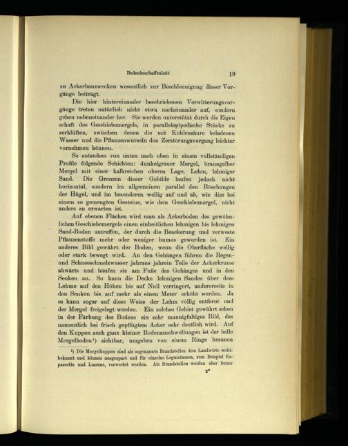 Die hier hintereinander beschriebenen Verwitterungsvor- gänge treten natürlich nicht etwa nacheinander auf, sondern gehen nebeneinander her. Sie werden unterstützt durch die Eigen schaft des Geschiebemergels, in parallelepipedische Stücke zu zerklüften, zwischen denen die mit Kohlensäure beladenen Wasser und die Pflanzenwurzeln den Zerstörungsvorgang leichter vornehmen können.