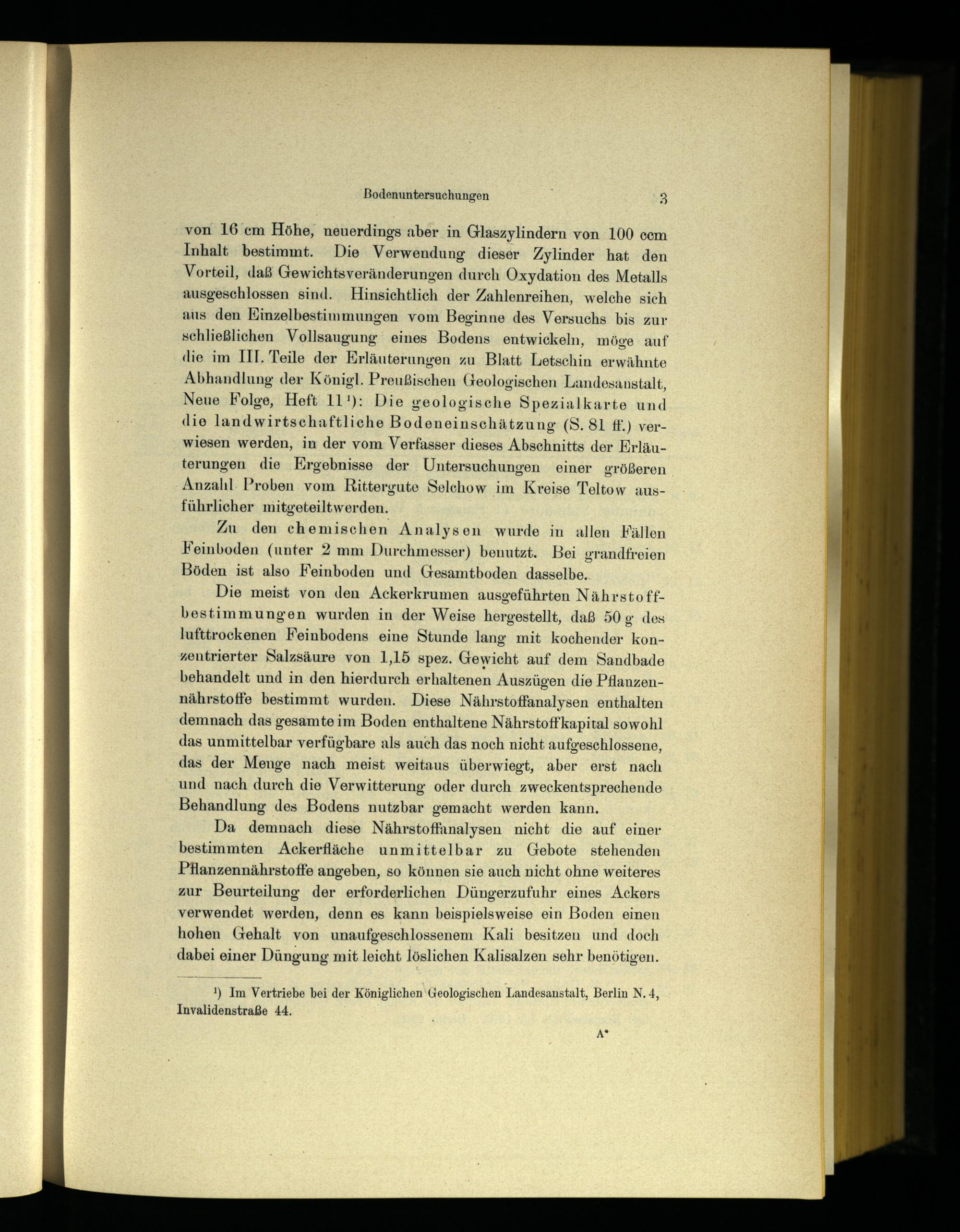 von 16 cm Höhe, neuerdings aber in Glaszylindern von 100 ccm Inhalt bestimmt. Die Verwendung dieser Zylinder hat den Vorteil, daß Gewichtsveränderungen durch Oxydation des Metalls ausgeschlossen sind. Hinsichtlich der Zahlenreihen, welche sich aus den Einzelhestimmungen vom Beginne des Versuchs bis zur schließlichen Vollsaugung eines Bodens entwickeln, möge auf die im III. Teile der Erläuterungen zu Blatt Letschin erwähnte Abhandlung der Königl. Preußischen Geologischen Landesanstalt, Neue Folge, Heft 11 1 ): Die geologische Spezialkarte und die landwirtschaftliche Bodeneinschätzung (S. 81 ff.) verwiesen werden, in der vom Verfasser dieses Abschnitts der Erläuterungen die Ergebnisse der Untersuchungen einer größeren Anzahl Proben vom Rittergute Selchow im Kreise Teltow ausführlicher mitgeteiltwerden.