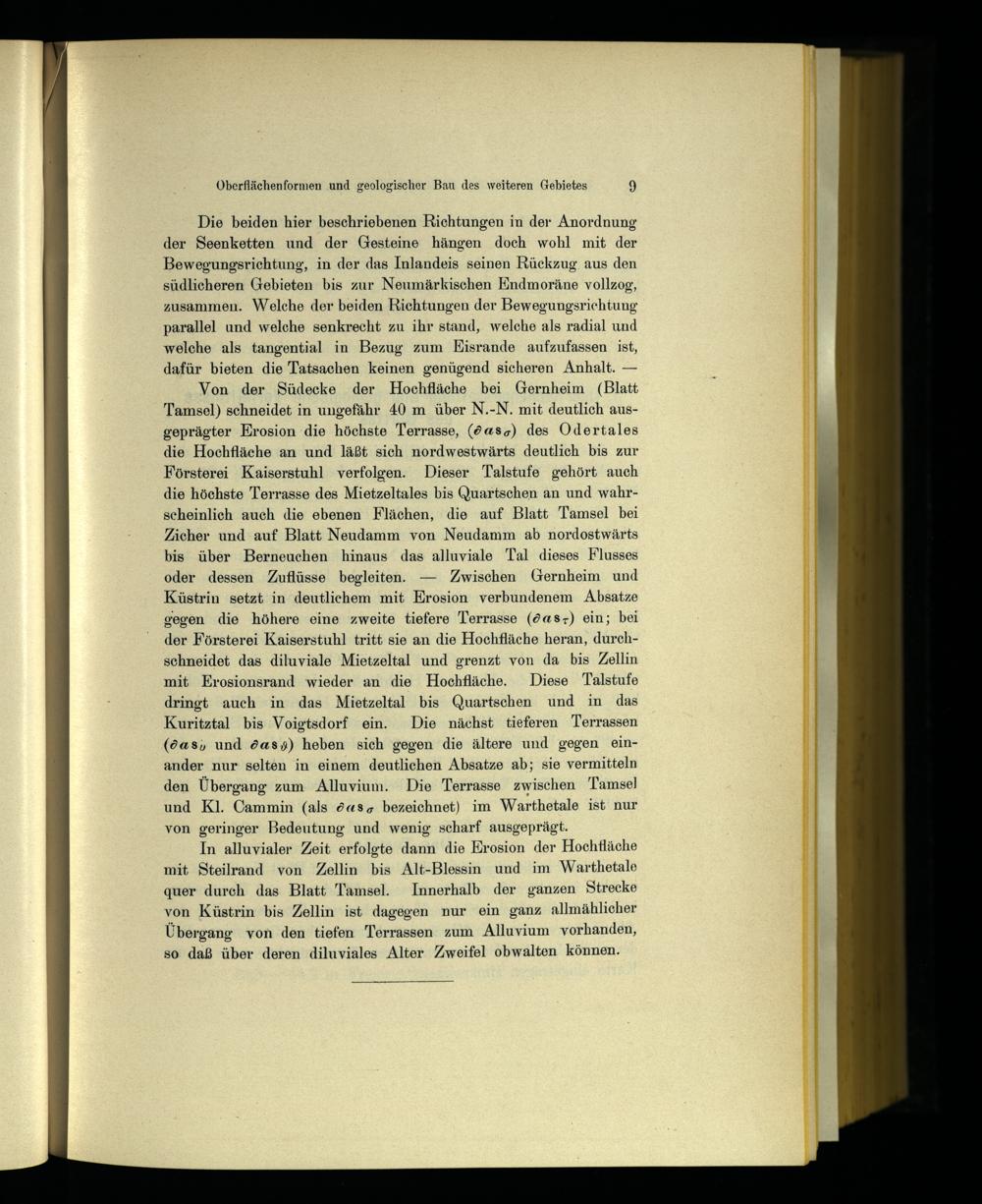Von der Südecke der Hochfläche bei Gernheim (Blatt Tamsol) schneidet in ungefähr 40 m über N.-N. mit deutlich ausgeprägter Erosion die höchste Terrasse, (da s CT ) des Odertales die Hochfläche an und läßt sich nordwestwärts deutlich bis zur Försterei Kaiserstuhl verfolgen. Dieser Talstufe gehört auch die höchste Terrasse des Mietzeltales bis Quartschen an und wahrscheinlich auch die ebenen Flächen, die auf Blatt Tamsel bei Zicher und auf Blatt Neudamm von Neudamm ab nordostwärts bis über Berneuchen hinaus das alluviale Tal dieses Flusses oder dessen Zuflüsse begleiten. — Zwischen Gernheim und Küstrin setzt in deutlichem mit Erosion verbundenem Absätze gegen die höhere eine zweite tiefere Terrasse (da s T ) ein; bei der Försterei Kaiserstuhl tritt sie an die Hochfläche heran, durchschneidet das diluviale Mietzeltal und grenzt von da bis Zellin mit Erosionsrand wieder an die Hochfläche. Diese Talstufe dringt auch in das Mietzeltal bis Quartschen und in das Kuritztal bis Voigtsdorf ein. Die nächst tieferen Terrassen (da$u und das, 1 /) heben sich gegen die ältere und gegen einander nur selten in einem deutlichen Absätze ab; sie vermitteln den Übergang zum Alluvium. Die Terrasse zwischen Tamsel und Kl. Cammin (als das a bezeichnet) im Warthetale ist nur von geringer Bedeutung und wenig scharf ausgeprägt.