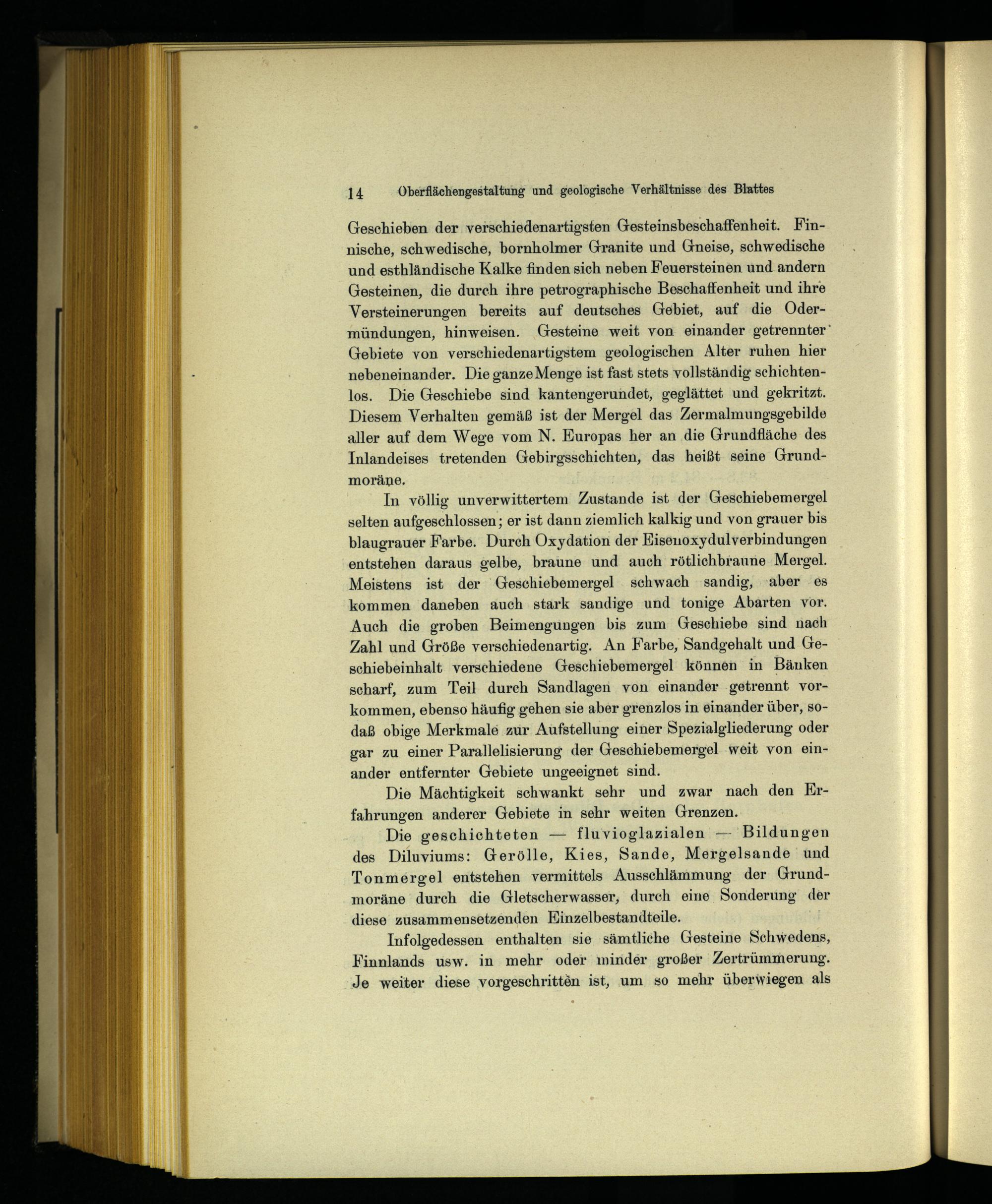 Die geschichteten — fluvioglazialen — Bildungen des Diluviums: Gerölle, Kies, Sande, Mergelsande und Tonmergel entstehen vermittels Ausschlämmung der Grundmoräne durch die Gletscherwasser, durch eine Sonderung der diese zusammensetzenden Einzelbestandteile.
