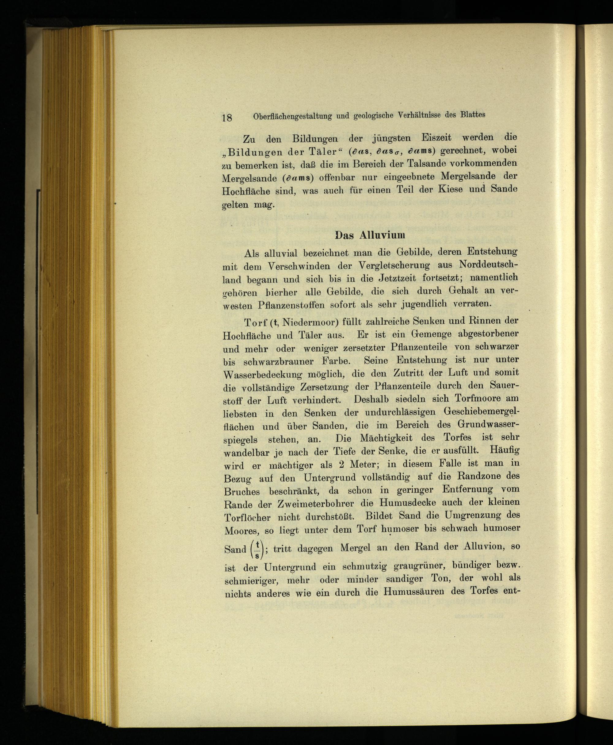 Als alluvial bezeichnet man die Gebilde, deren Entstehung mit dem Verschwinden der Vergletscherung aus Norddeutschland begann und sich bis in die Jetztzeit fortsetzt; namentlich gehören hierher alle Gebilde, die sich durch Gehalt an verwesten Pflanzenstoffen sofort als sehr jugendlich verraten.