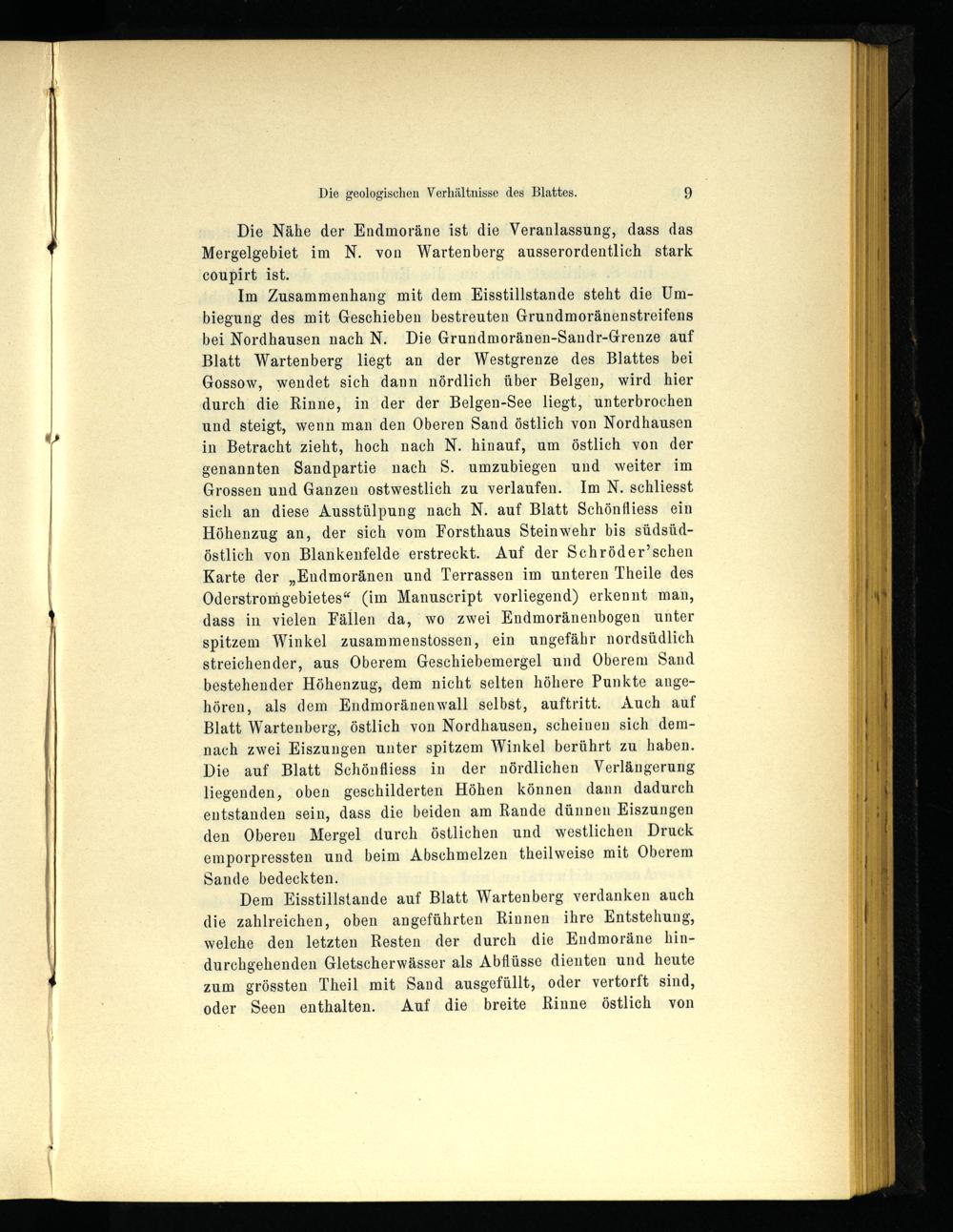 Im Zusammenhang mit dem Eisstillstande steht die Umbiegung des mit Geschieben bestreuten Grundmoränenstreifens bei Nordhausen nach N. Die Grundmoränen-Sandr-Grenze auf Blatt Wartenberg liegt an der Westgrenze des Blattes bei Gossow, wendet sich dann nördlich über Belgen, wird hier durch die Rinne, in der der Belgen-See liegt, unterbrochen und steigt, wenn man den Oberen Sand östlich von Nordhausen in Betracht zieht, hoch nach N. hinauf, um östlich von der genannten Sandpartie nach S. umzubiegen und weiter im Grossen und Ganzen ostwestlich zu verlaufen. Im N. schliesst sich an diese Ausstülpung nach N. auf Blatt Schönfliess ein Höhenzug an, der sich vom Forsthaus Steinwehr bis südsüdöstlich von Blankenfelde erstreckt. Auf der Schröder’schen Karte der „Endmoränen und Terrassen im unteren Theile des Oderstromgebietes“ (im Manuscript vorliegend) erkennt man, dass in vielen Fällen da, wo zwei Endmoränenbogen unter spitzem Winkel zusammenstossen, ein ungefähr nordsüdlich streichender, aus Oberem Geschiebemergel und Oberem Sand bestehender Höhenzug, dem nicht selten höhere Punkte angehören, als dem Endmoränenwall selbst, auftritt. Auch auf Blatt Wartenberg, östlich von Nordhausen , scheinen sich demnach zwei Eiszungen unter spitzem Winkel berührt zu haben. Die auf Blatt Schönfliess in der nördlichen Verlängerung liegenden, oben geschilderten Höhen können dann dadurch entstanden sein, dass die beiden am Rande dünnen Eiszungen den Oberen Mergel durch östlichen und westlichen Druck emporpressten und beim Abschmelzen theilweise mit Oberem Sande bedeckten.