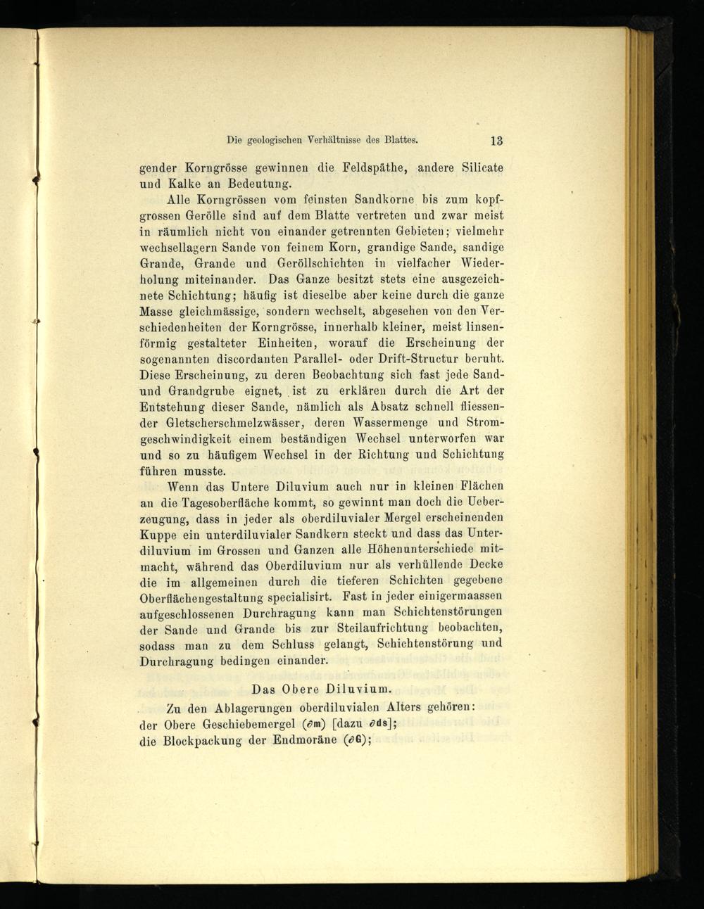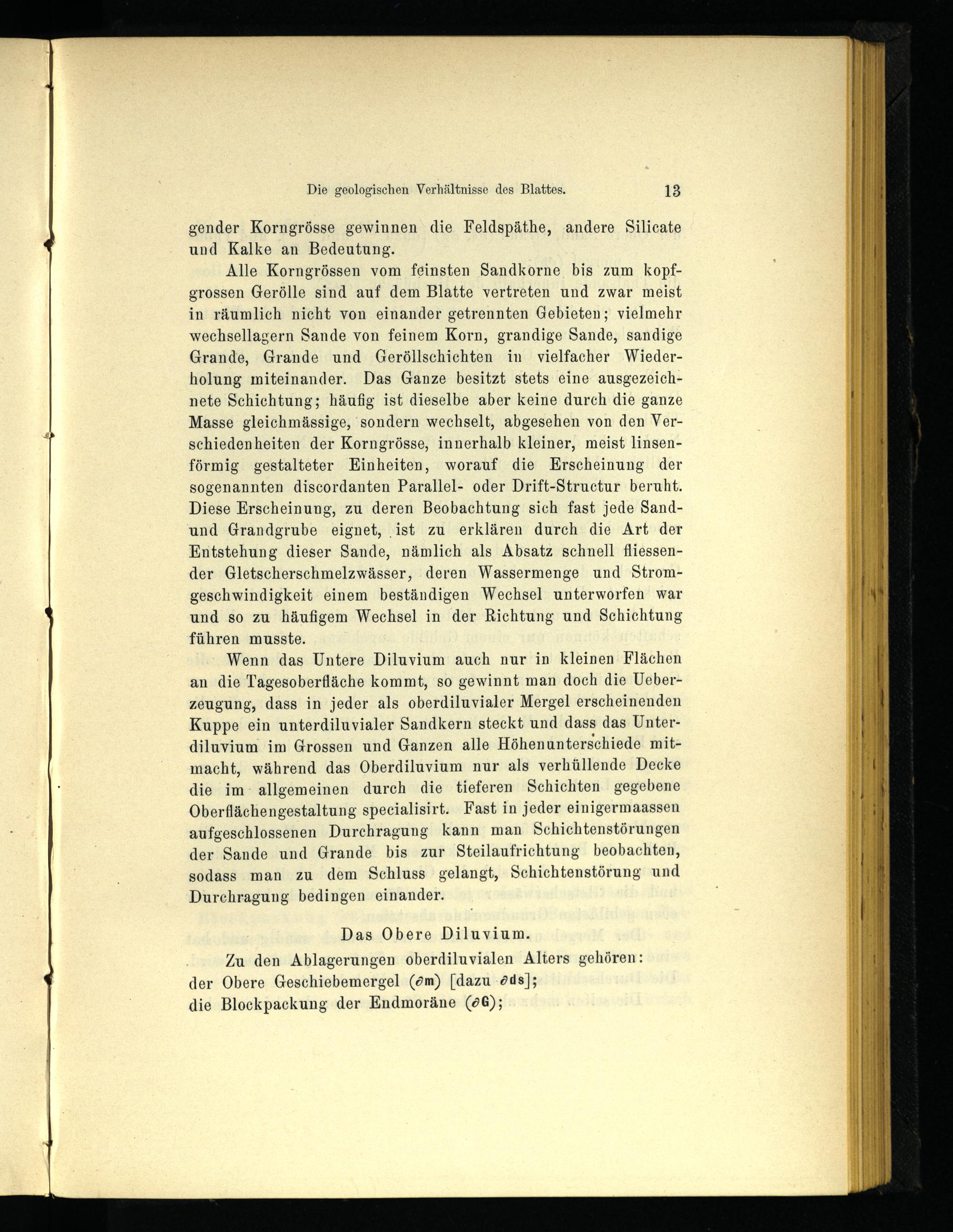 Alle Korngrössen vom feinsten Sandkorne bis zum kopfgrossen Gerölle sind auf dem Blatte vertreten und zwar meist in räumlich nicht von einander getrennten Gebieten; vielmehr vvechsellagern Sande von feinem Korn, grandige Sande, sandige Grande, Grande und Geröllschichten in vielfacher Wiederholung miteinander. Das Ganze besitzt stets eine ausgezeichnete Schichtung; häufig ist dieselbe aber keine durch die ganze Masse gleichmässige, sondern wechselt, abgesehen von den Verschiedenheiten der Korngrösse, innerhalb kleiner, meist linsenförmig gestalteter Einheiten, worauf die Erscheinung der sogenannten discordanten Parallel- oder Drift-Structur beruht. Diese Erscheinung, zu deren Beobachtung sich fast jede Sand- und Grandgrube eignet, ist zu erklären durch die Art der Entstehung dieser Sande, nämlich als Absatz schnell fliessen- der Gletscherschmelzwässer, deren Wassermenge und Stromgeschwindigkeit einem beständigen Wechsel unterworfen war und so zu häufigem Wechsel in der Richtung und Schichtung führen musste.