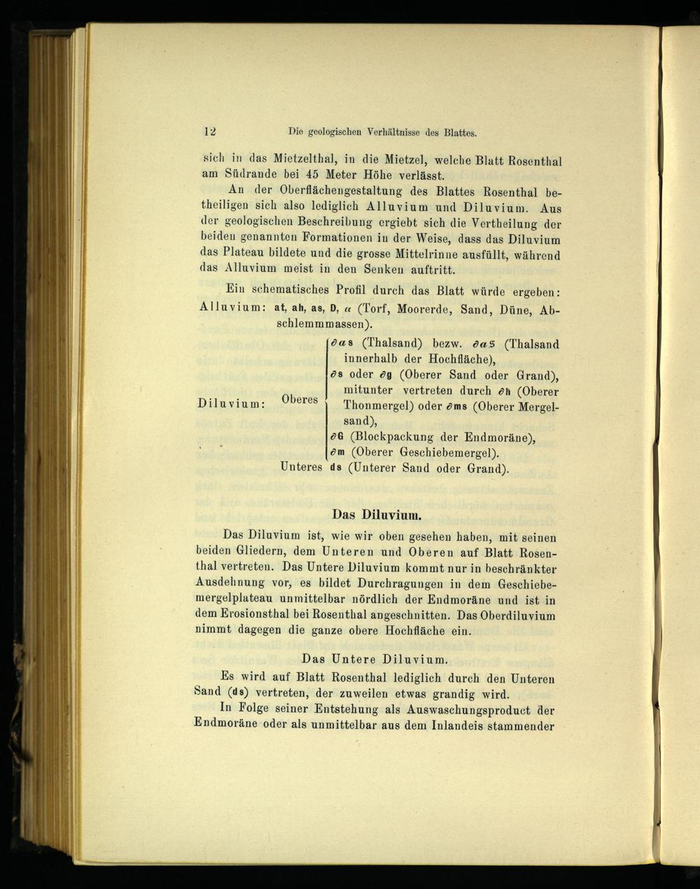 Das Diluvium ist, wie wir oben gesehen haben, mit seinen beiden Gliedern, dem Unteren und Oberen auf Blatt Rosenthal vertreten. Das Untere Diluvium kommt nur in beschränkter Ausdehnung vor, es bildet Durchragungen in dem Geschiebemergelplateau unmittelbar nördlich der Endmoräne und ist in dem Erosionsthal bei Rosenthal angeschnitten. Das Oberdiluvium nimmt dagegen die ganze obere Hochfläche ein.