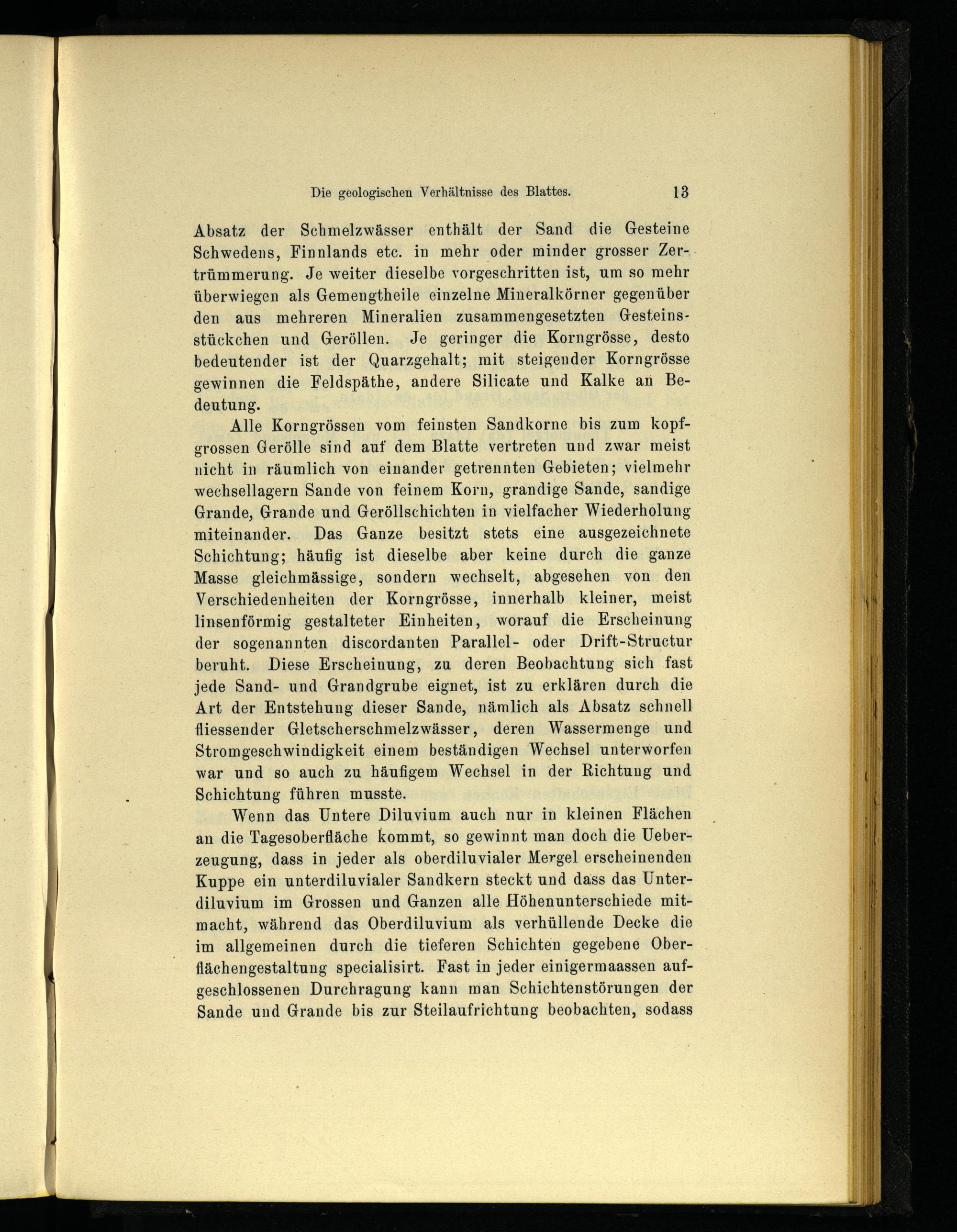 Alle Korngrössen vom feinsten Sandkorne bis zum kopfgrossen Gerölle sind auf dem Blatte vertreten und zwar meist nicht in räumlich von einander getrennten Gebieten; vielmehr wechsellagern Sande von feinem Korn, grandige Sande, sandige Grande, Grande und Geröllschichten in vielfacher Wiederholung miteinander. Das Ganze besitzt stets eine ausgezeichnete Schichtung; häufig ist dieselbe aber keine durch die ganze Masse gleichmässige, sondern wechselt, abgesehen von den Verschiedenheiten der Korngrösse, innerhalb kleiner, meist linsenförmig gestalteter Einheiten, worauf die Erscheinung der sogenannten discordanten Parallel- oder Drift-Structur beruht. Diese Erscheinung, zu deren Beobachtung sich fast jede Sand- und Grandgrube eignet, ist zu erklären durch die Art der Entstehung dieser Sande, nämlich als Absatz schnell fliessender Gletscherschmelzwässer, deren Wassermenge und Stromgeschwindigkeit einem beständigen Wechsel unterworfen war und so auch zu häufigem Wechsel in der Richtung und Schichtung führen musste.