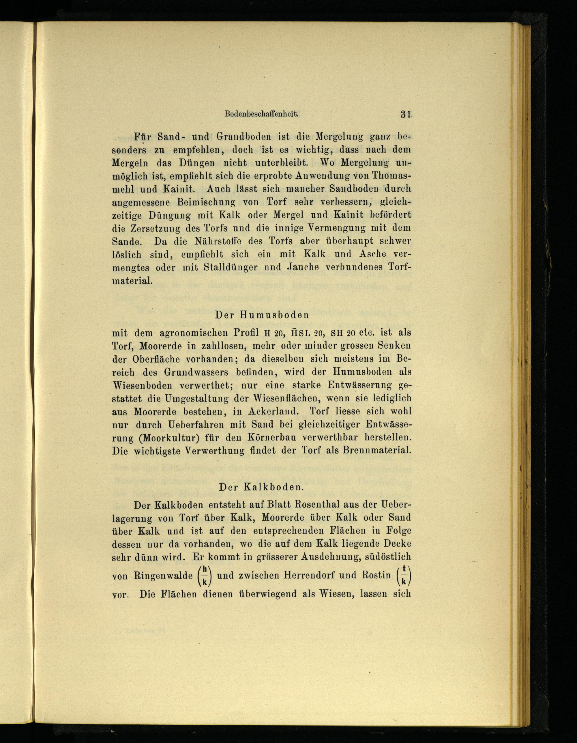 Der Kalkboden. Der Kalkboden entsteht auf Blatt Rosenthal aus der Ueber- lagerung von Torf über Kalk, Moorerde über Kalk oder Sand über Kalk und ist auf den entsprechenden Flächen in Folge dessen nur da vorhanden, wo die auf dem Kalk liegende Decke sehr dünn wird. Er kommt in grösserer Ausdehnung, südöstlich