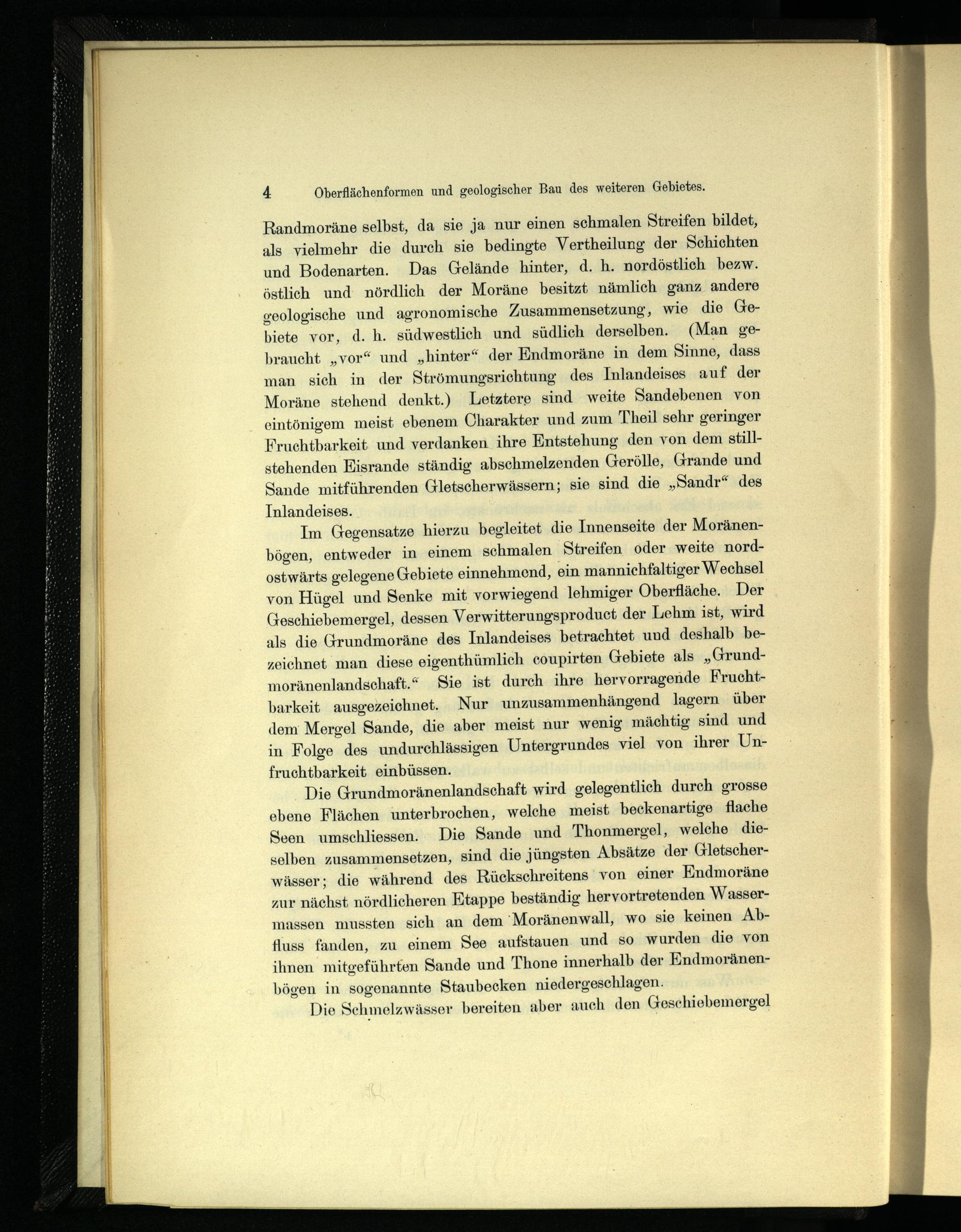 Die Grundmoränenlandschaft wird gelegentlich durch grosse ebene Flächen unterbrochen, welche meist beckenartige flache Seen umschliessen. Die Sande und Thonmergel, welche dieselben zusammensetzen, sind die jüngsten Absätze der Gletscherwässer; die während des Rückschreitens von einer Endmoräne zur nächst nördlicheren Etappe beständig hervortretenden Wassermassen mussten sich an dem Moränenwall, wo sie keinen Abfluss fanden, zu einem See aufstauen und so wurden die von ihnen mitgeführten Sande und Thone innerhalb der Endmoränen- bögen in sogenannte Staubecken niedergeschlagen.