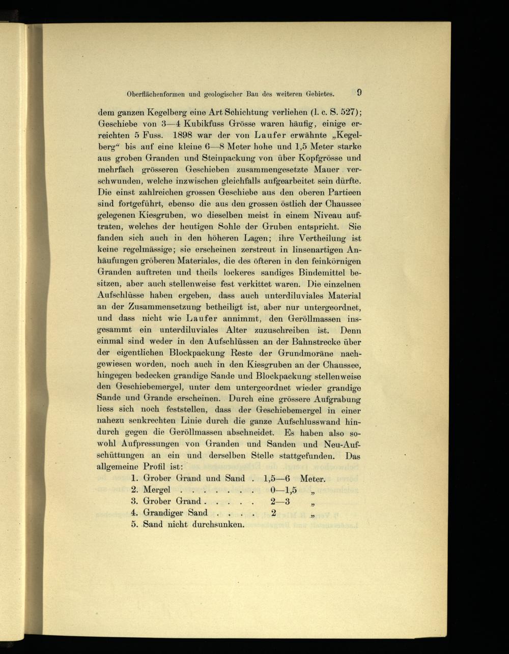 dem ganzen Kegelberg eine Art Schichtung verliehen (1. c. S. 527); Geschiebe von 3—4 Kubikfuss Grösse waren häufig, einige erreichten 5 Fuss. 1898 war der von Läufer erwähnte „Kegelberg“ bis auf eine kleine 6—8 Meter hohe und 1,5 Meter starke aus groben Granden und Steinpackung von über Kopfgrösse und mehrfach grösseren Geschieben zusammengesetzte Mauer verschwunden, welche inzwischen gleichfalls aufgearbeitet sein dürfte. Die einst zahlreichen grossen Geschiebe aus den oberen Partieen sind fortgeführt, ebenso die aus den grossen östlich der Chaussee gelegenen Kiesgruben, wo dieselben meist in einem Niveau auftraten, welches der heutigen Sohle der Gruben entspricht. Sie fanden sich auch in den höheren Lagen; ihre Vertheilung ist keine regelmässige; sie erscheinen zerstreut in linsenartigen Anhäufungen gröberen Materiales, die des öfteren in den feinkörnigen Granden auftreten und theils lockeres sandiges Bindemittel besitzen, aber auch stellenweise fest verkittet waren. Die einzelnen Aufschlüsse haben ergeben, dass auch untordiluviales Material an der Zusammensetzung betheiligt ist, aber nur untergeordnet, und dass nicht wie Läufer annimmt, den Geröllmassen ins- gesammt ein unterdiluviales Alter zuzuschreiben ist. Denn einmal sind weder in den Aufschlüssen an der Bahnstrecke über der eigentlichen Blockpackung Reste der Grundmoräne nachgewiesen worden, noch auch in den Kiesgruben an der Chaussee, hingegen bedecken grandige Sande und Blockpackung stellenweise den Geschiebemergel, unter dem untergeordnet wieder grandige Sande und Grande erscheinen. Durch eine grössere Aufgrabung liess sich noch feststellen, dass der Geschiebemergel in einer nahezu senkrechten Linie durch die ganze Aufschlusswand hindurch gegen die Geröllmassen abschneidet. Es haben also sowohl Aufpressungen von Granden und Sanden und Neu-Auf- schüttungen an ein und derselben Stelle stattgefunden. Das allgemeine Profil ist: