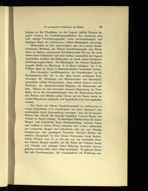 Schliesslich sei hier noch erwähnt, dass ein weiteres charakteristisches Merkmal des Oberen Geschiebemergels sein Reichthum an kleinen und grossen Geschieben jeder Art ist, die nicht selten einen Cubikmeter und mehr halten; namentlich die Gegend unmittelbar nördlich der Endmoräne ist durch starke Geschiebeschüttung ausgezeichnet. Die Mächtigkeit des Oberen Geschiebemergels dürfte im Maximum 8—9 Meter betragen; bis 5 bis 6 Meter kann sie direct in Bahneinschnitten beobachtet werden.