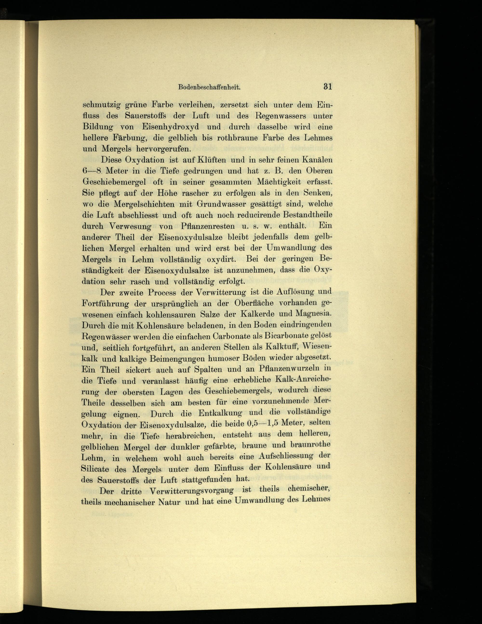 schmutzig grüne Farbe verleihen, zersetzt sich unter dem Einfluss des Sauerstoffs der Luft und des Regenwassers unter Bildung von Eisenhydroxyd und durch dasselbe wird eine hellere Färbung, die gelblich bis rothbraune Farbe des Lehmes und Mergels hervorgerufen.