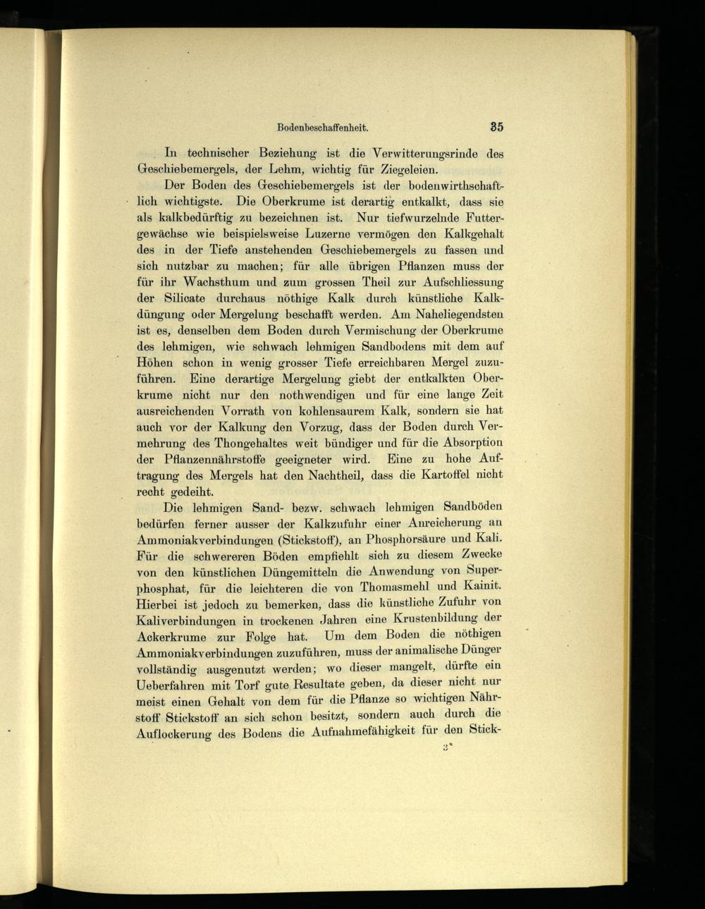 Der Boden des Greschiebemergels ist der bodenwirthschaft- lich wichtigste. Die Oberkrume ist derartig entkalkt, dass sie als kalkbedürftig zu bezeichnen ist. Nur tiefwurzelnde Futtergewächse wie beispielsweise Luzerne vermögen den Kalkgehalt des in der Tiefe anstehenden Geschiebemergels zu fassen und sich nutzbar zu machen; für alle übrigen Pflanzen muss der für ihr Wachsthum und zum grossen Theil zur Aufschliessung der Silicate durchaus nöthige Kalk durch künstliche Kalkdüngung oder Mergelung beschafft werden. Am Naheliegendsten ist es, denselben dem Boden durch Vermischung der Oberkrume des lehmigen, wie schwach lehmigen Sandbodens mit dem auf Höhen schon in wenig grosser Tiefe erreichbaren Mergel zuzuführen. Eine derartige Mergelung giebt der entkalkten Oberkrume nicht nur den nothwendigen und für eine lange Zeit ausreichenden Vorrath von kohlensaurem Kalk, sondern sie hat auch vor der Kalkung den Vorzug, dass der Boden durch Vermehrung des Thongehaltes weit bündiger und für die Absorption der Pflanzennährstoffe geeigneter wird. Eine zu hohe Auftragung des Mergels hat den Nachtheil, dass die Kartoffel nicht recht gedeiht.