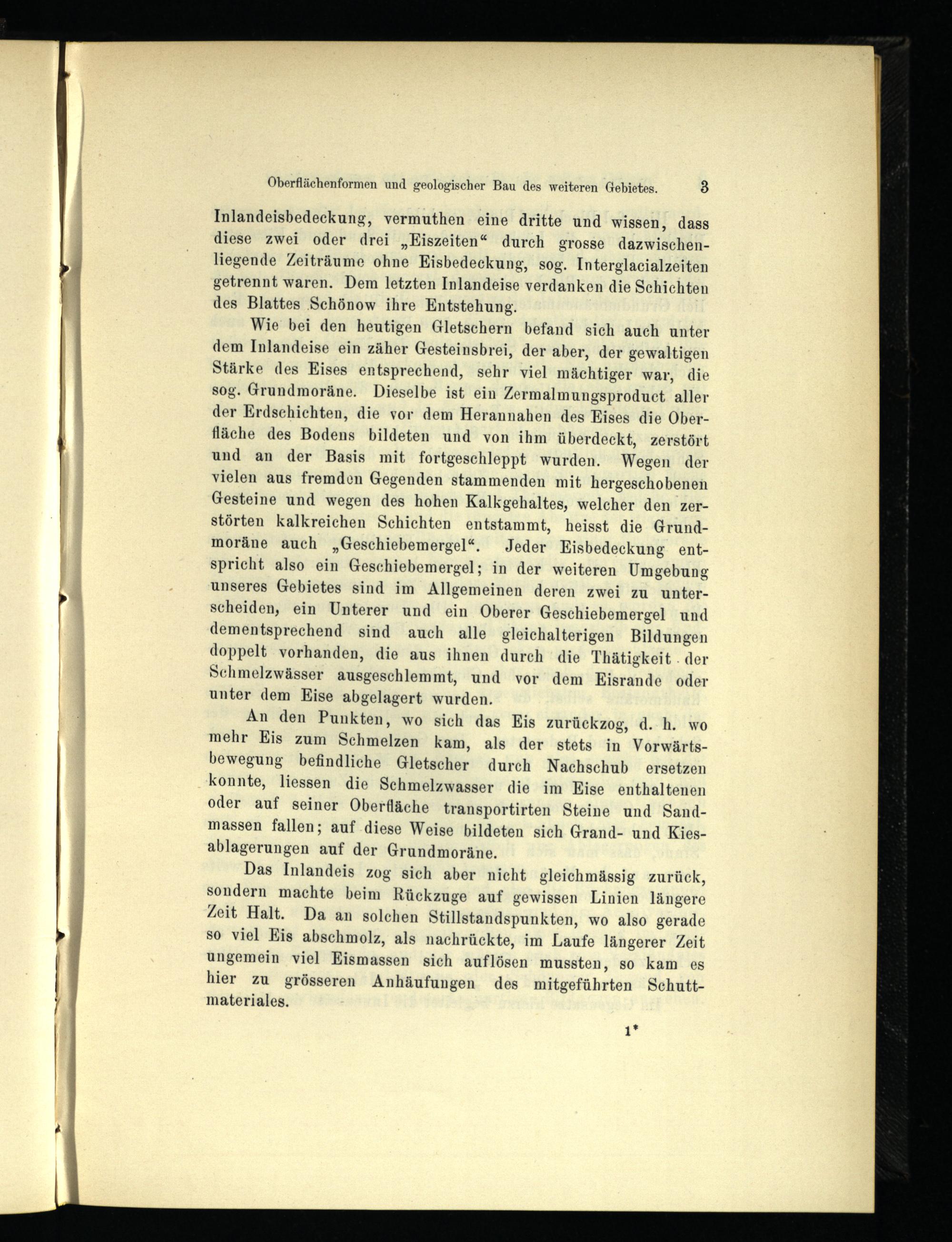 Inlandeisbedeckung, vermuthen eine dritte und wissen, dass diese zwei oder drei „Eiszeiten“ durch grosse dazwischenliegende Zeiträume ohne Eisbedeckung, sog. Interglacialzeiten getrennt waren. Dem letzten Inlandeise verdanken die Schichten des Blattes Schönow ihre Entstehung.