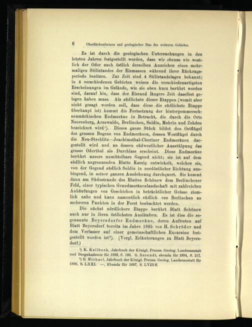 Die nächst nördlichere Etappe berührt Blatt Schönow auch nur in ihren östlichsten Ausläufern. Es ist dies die sogenannte Beyersdorfer Endmoräne, deren Auftreten auf Blatt Beyersdorf bereits im Jahre 1895 von H. Schröder und dem Verfasser auf einer gemeinschaftlichen Excursion festgestellt worden ist 2 ). (Vergl. Erläuterungen zu Blatt Beyersdorf.)