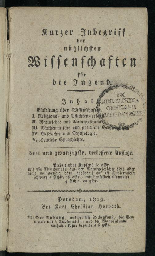 Kurzer Inbegriff der nützlichsten Wissenschaften für die Jugend : Inhalt: Einleitung über Wissenschaften. I. Religions- und Pflichten-Lehren. II. Naturlehre und Naturgeschichte. III. Mathematische und politische Geographie. IV. Geschichte und Mythologie. V. Deutsche Sprachlehre ... / [Karl Friedrich Daniel]