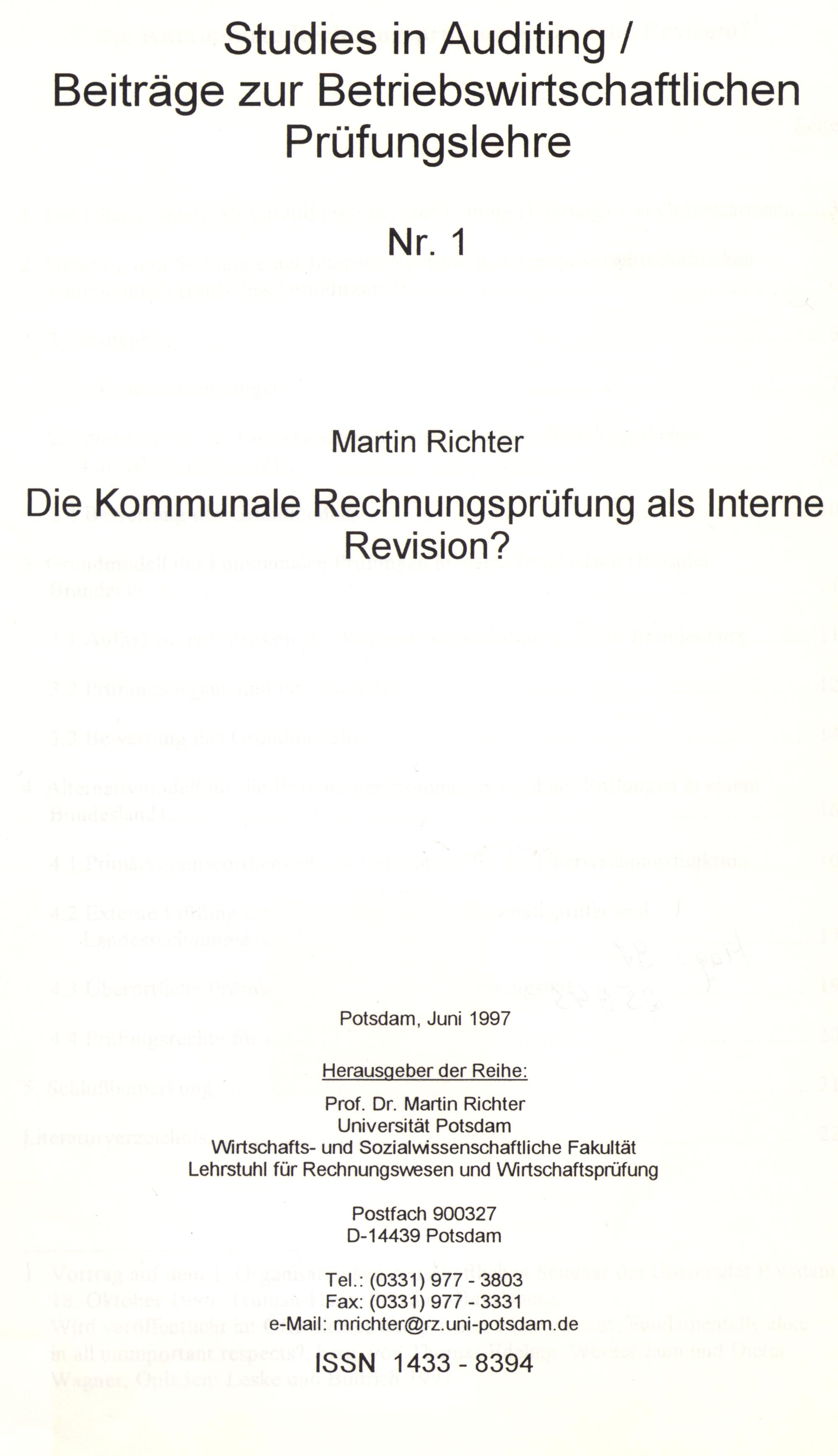 Die kommunale Rechnungsprüfung als interne Revision? / Martin Richter. [Universität Potsdam, Lehrstuhl für Rechnungswesen und Wirtschaftsprüfung]