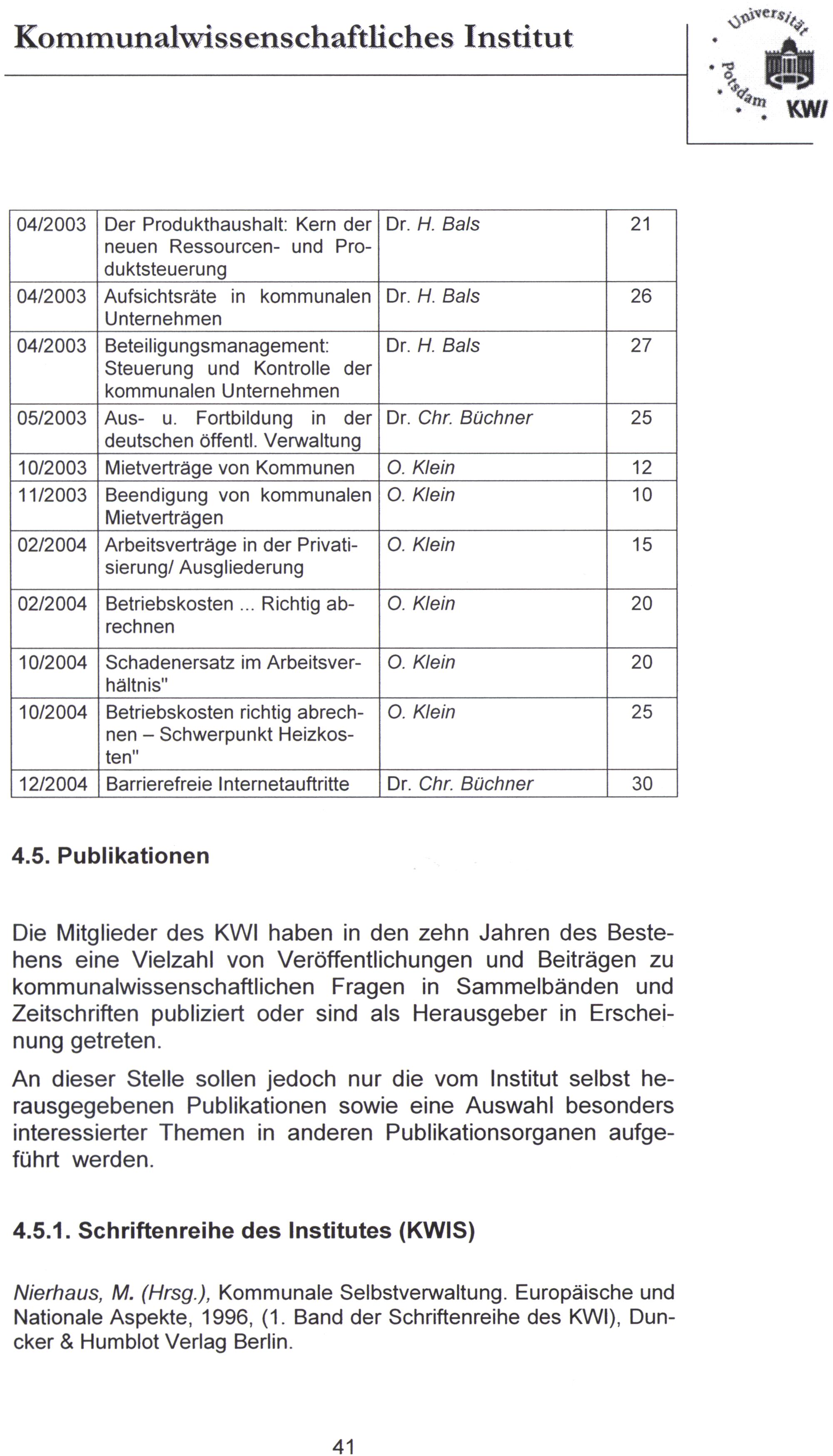 10 Jahre Kommunalwissenschaftliches Institut : Tätigkeitsbericht 1994 - 2004 / Hrsg.von Michael Nierhaus