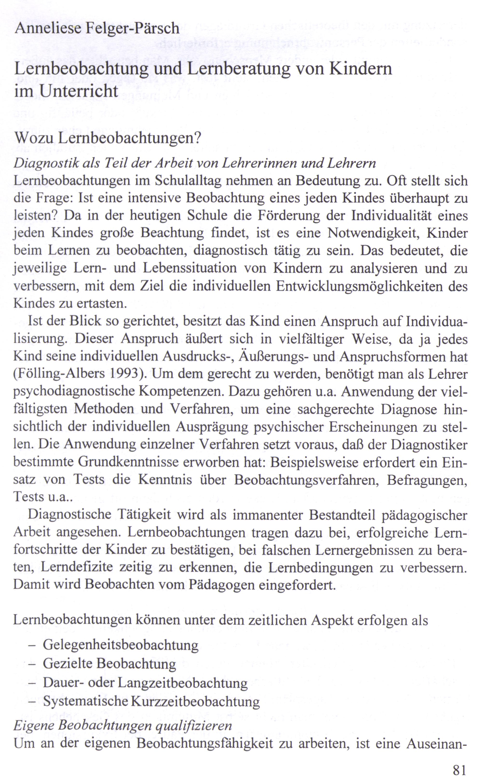 Felger-Pärsch, Anneliese, Lernbeobachtung und Lernberatung von Kindern im Unterricht