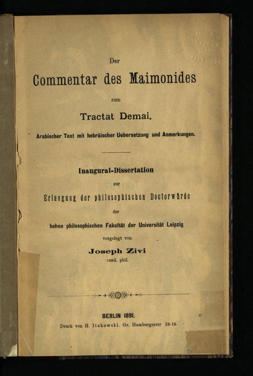 Der Commentar des Maimonides zum Tractat Demai : Arabischer Text mit hebräischer Uebersetzung und Anmerkungen / Joseph Zivi