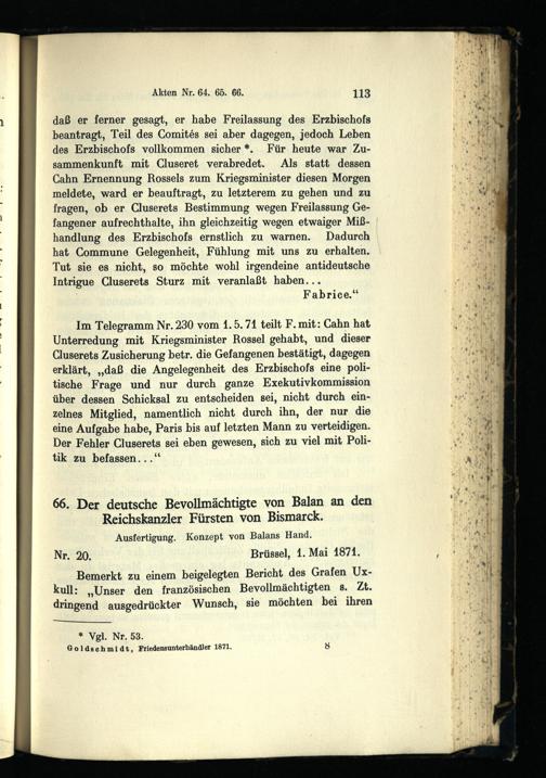 Bismarck und die Friedensunterhändler 1871 : die deutsch-französischen Friedensverhandlungen zu Brüssel und Frankfurt März - Dezember 1871 / bearb. von Hans Goldschmidt
