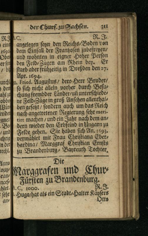 Anhang (1698) Curiöser Anhang : Worinnen enthalten Eine kurtze Beschreibung aller Päbste/ Kayser/ Könige und Chur-Fürsten ...Von Anfang ihrer Regierung/ biß auf dieses 1698ste Jahr ... ; In vielen verbessert/ und mit den Königen oder Groß-Moguln in Indien ... und Hertzogen zu Venedig vermehret