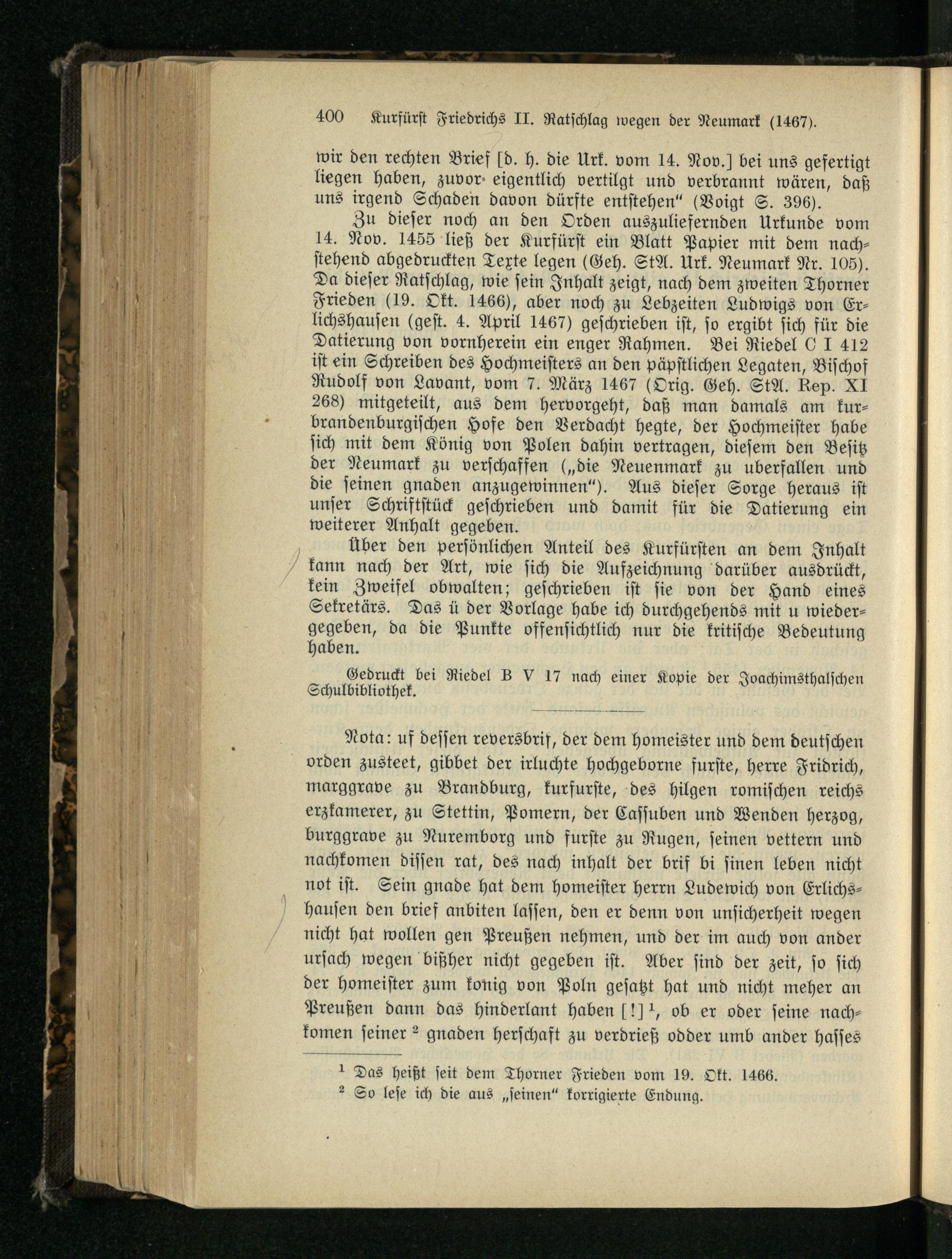 Beilage Nr. 1. Kurfürst Friedrich II. gibt seinen Nachfolgern den Rat, die Neumark...