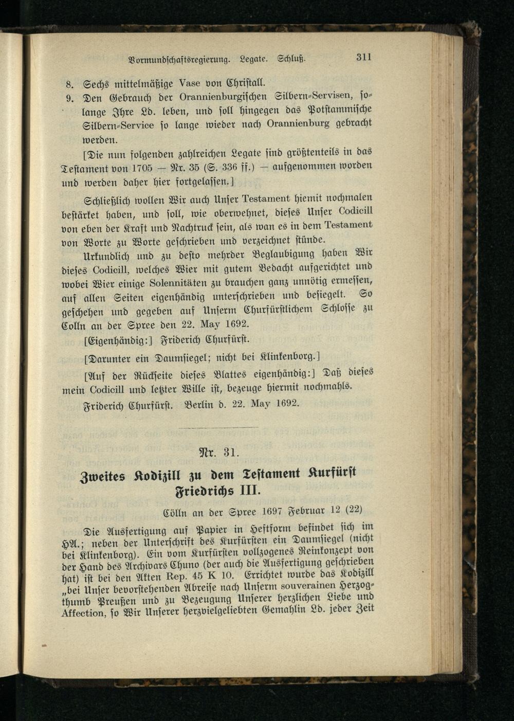 Nr. 31. Zweites Kodizill zu dem Testament Kurfürst Friedrichs III.
