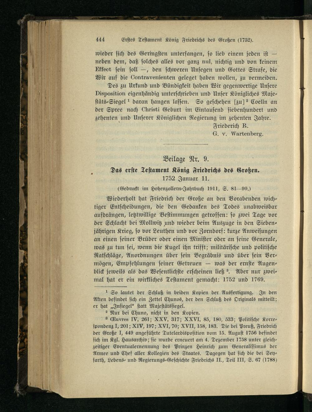 Beilage Nr. 9. Das erste Testament König Friedrichs des Großen.