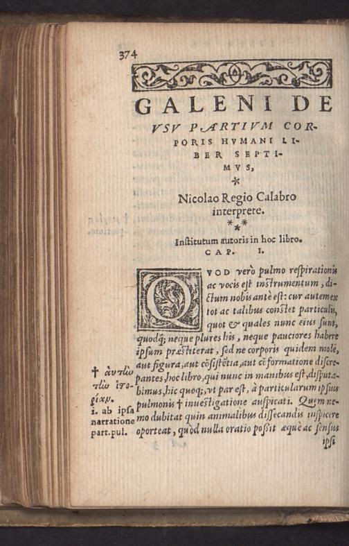 Cl. Gal. De Vsv Partivm Corporis Hvmani Libri XVII. / Nicolao Regio Calabre interprete, ex plurium Græcorum exemplarium collatione castigatiores quàm vnquam aliâs ...