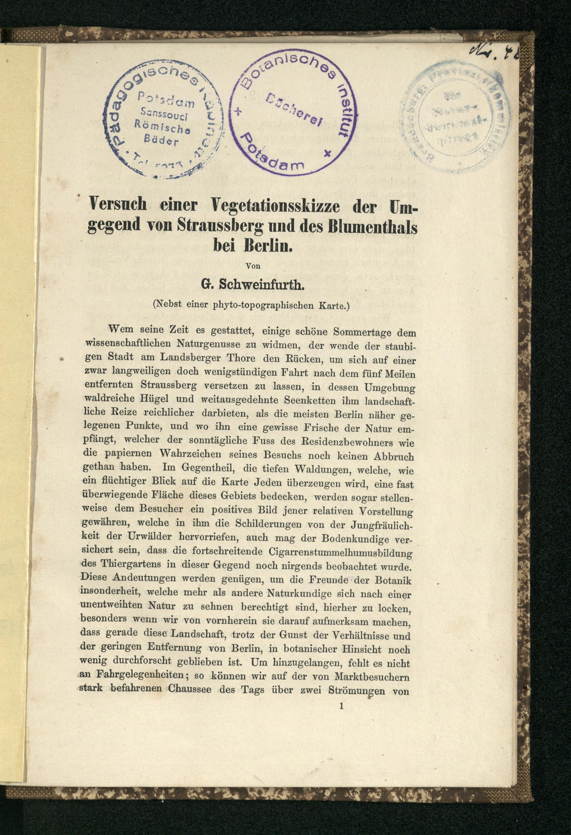 Versuch einer Vegetationsskizze der Umgegend von Straussberg und des Blumentals bei Berlin : Nebst einer phyto-topographischen Karte / Georg Schweinfurth